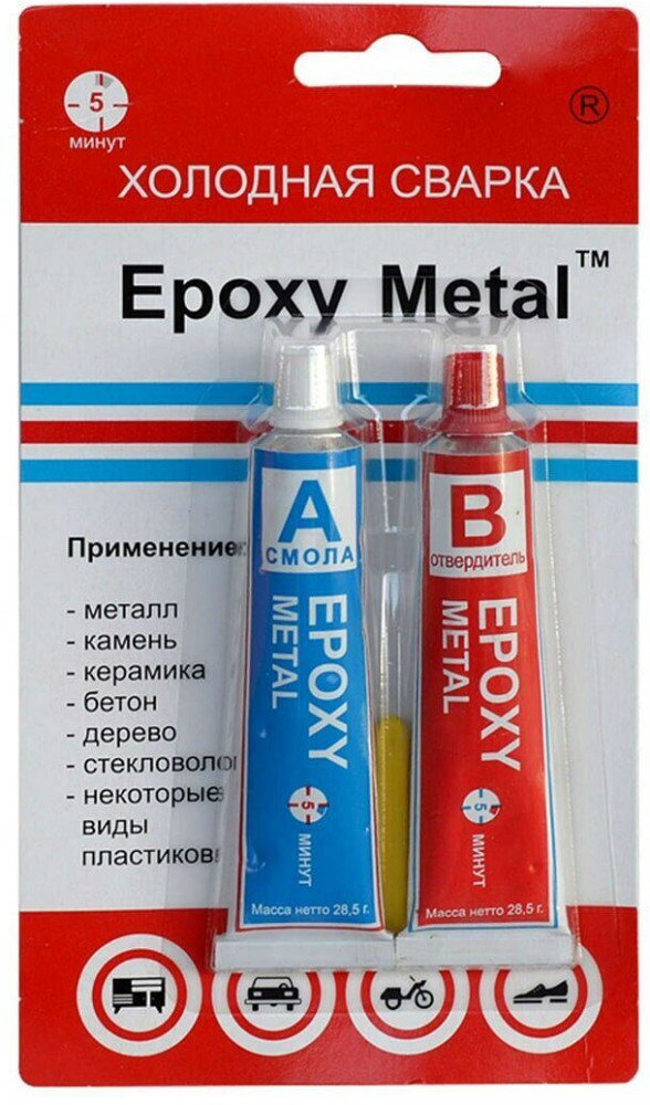 Холодная сварка «Epoxy Metal» поможет Вам в ремонте и восстановлении инструментов, автомобилей, велосипедов, металлических заборов, деталей мотоциклов. Благодаря качественному составу сварка обладает термостойкостью и обладает стойкостью к морской воде, разбавленным кислотам, щелочам и растворителям. Сварка устойчива к силе, вибрации и напряжению. Благодаря высокой износостойкости она может подвергаться окраске, шлифовке и т. д. Холодная сварка прекрасно подходит для работы с керамикой, сварки металлов с другими материалами, камнем, резиной, древесиной, бетоном, изделиями из слоновой кости и т. д. Может использоваться для заполнения трещин, заделки пустот, пор и отверстий, ремонта и шпаклевания плоских поверхностей, восстановления резьбы. Надежное средство для прочного склеивания, ремонта и шпатлевки изделий из металлов (сталь, медь, алюминий, латунь, железа, олово, свинец) и их сплавов, которые эксплуатируются в экстремальных условиях.