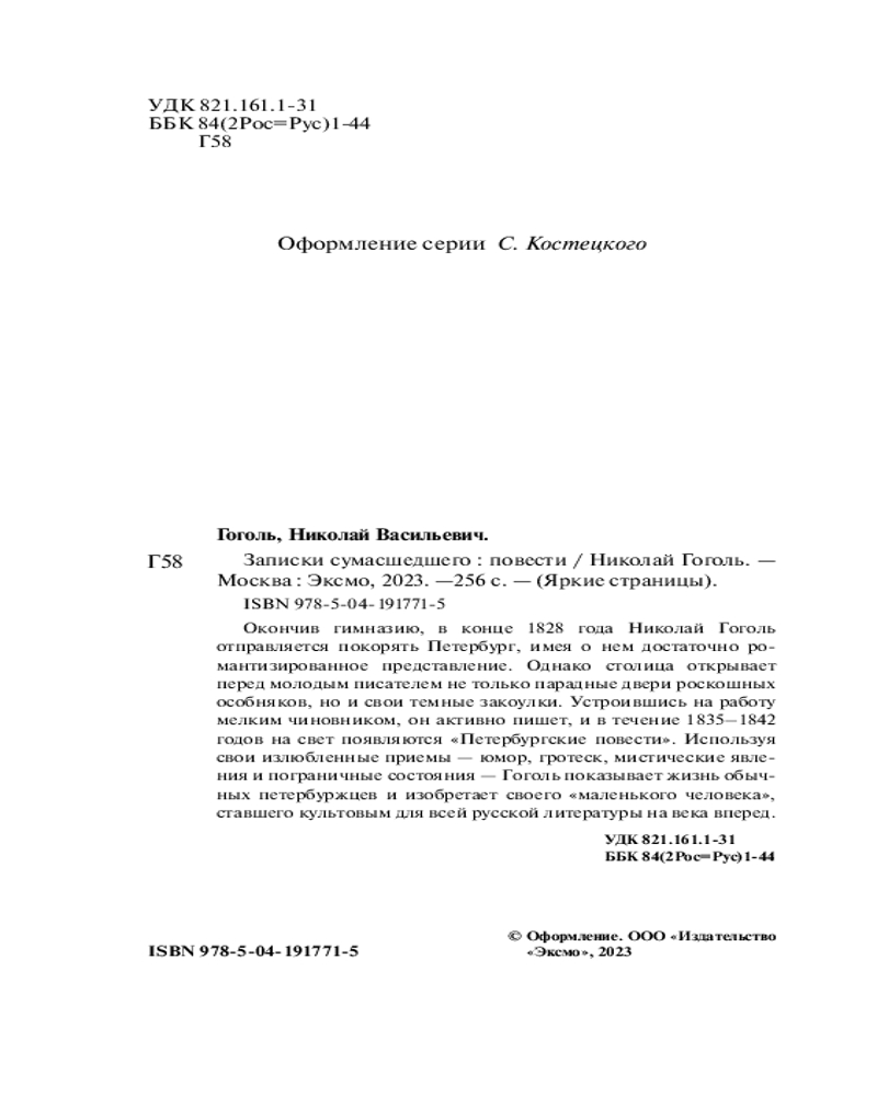 Серия: Яркие страницы Окончив гимназию, в конце 1828 года Николай Гоголь отправляется покорять Петербург, имея о нем достаточно романтизированное представление. Однако столица открывается перед молодым писателем не только парадные двери роскошных особняков, но и свои темные закоулки. Устроившись на работу мелким чиновником, он активно пишет, и в течение 1835–1842 годов на свет появляются «Петербургские повести». Используя свои излюбленные приемы — юмор, гротеск, мистические явления и пограничные состояния, — Гоголь показывает жизнь обычных петербуржцев и изобретает своего «маленького человека», ставшего культовым для всей русской литературы на века вперед. |