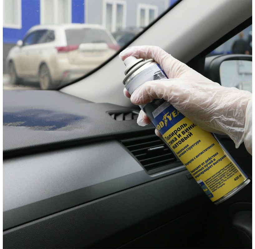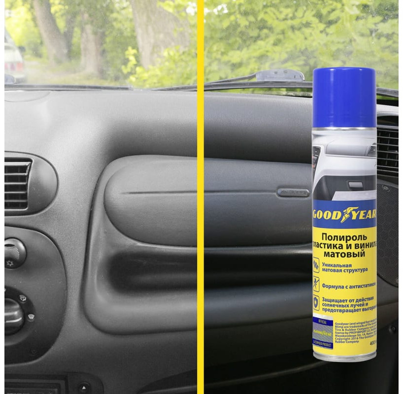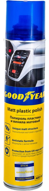 Матовый полироль пластика Goodyear, аэрозоль применяется для ухода за пластиковыми, резиновыми и виниловыми поверхностями интерьера автомобиля. Бережно удаляет загрязнения и полирует, возвращая элементам яркий цвет и создает эффектное матовое покрытие. Средство не оставляет липкого жирного следа. Благодаря антистатическим составляющим полироль защищает обработанную поверхность от пыли на длительный срок.