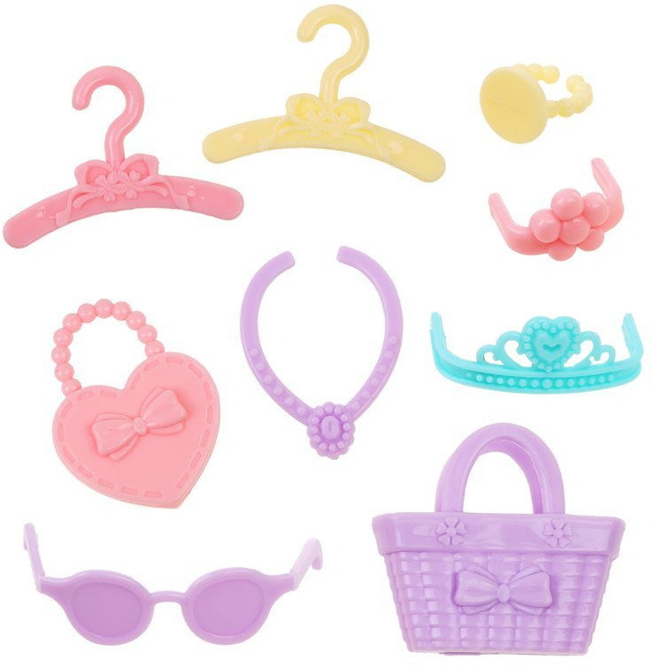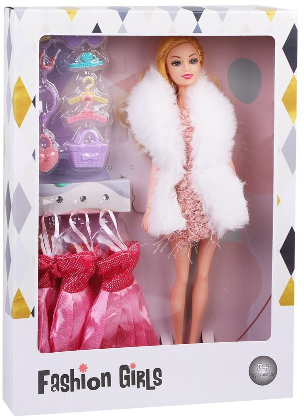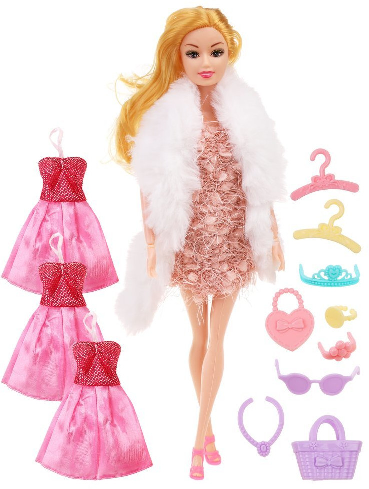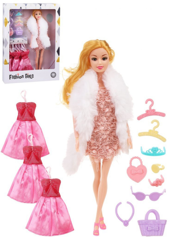 В комплекте: куколка, 3 платья, 2 сумочки, очки, плечики для вещей (2 шт.), украшения (4 шт.).