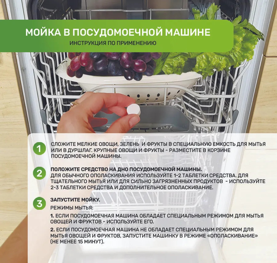 не знаю насколько эффективно моет зелень, но удобно тем, что не надо покупать отдельно уксус, соду долго растворять соль. Закинул таблетку в воду, замучил зелень, промыл и готово. А ещё буду знать, что можно мыть фрукты в посудомойке.