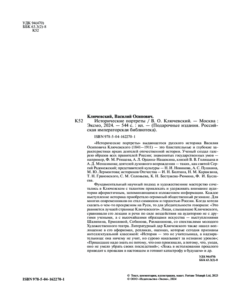 Настоящее издание знакомит читателя с Ключевским-портретистом — в его монументальных «Исторических портретах» собрана целая галерея образов: среди них и правители России — Иван Грозный, Петр I, императрицы Елизавета Петровна и Екатерина II; и государственные деятели — князья В. В. Голицын и А. Д. Меншиков; и светила русской поэзии — А. С. Пушкин, М. Ю. Лермонтов. |