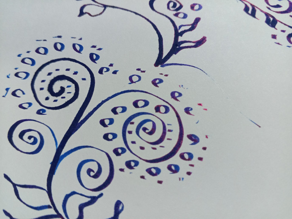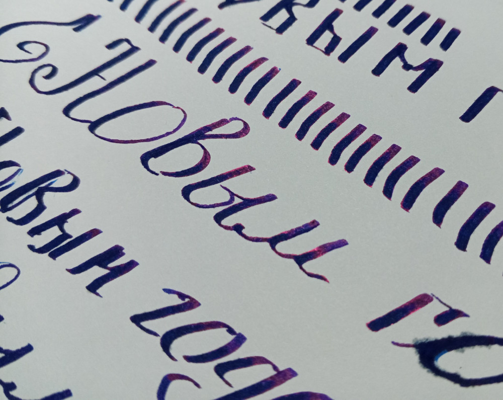 Хорошие чернила. Красиво переливаются под лампой, на разной поверхности ведут себя не одинаково (видно на фото), где то очень сильно переливы, а на другой фактуре (бумага более гладкая) не так сильно распадаются.