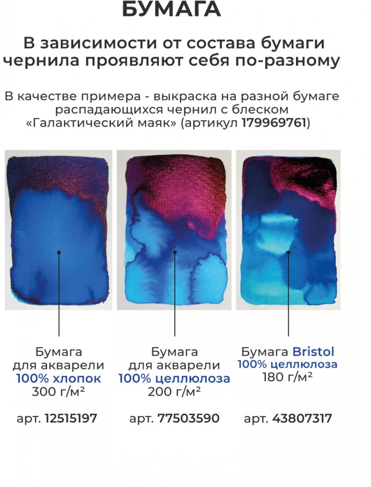 Распадаются красиво, но надо много чернил брать на кисть чтобы прям были явные эффекты распадания цветов на оттенки, т.е. очень не экономичный расход. Если ими не рисовать, а заливать в ручку, то хорошо подходят и хорошо пишут в ручке, но эффекта от распадания цветов почти не заметно в ручке, т.к. как выше писала для эффекта нужно много чернил наливать прям на бумагу, а в ручке при письме выдается не так много чтобы были заметны переходы цвета. Очень пигментированные, только открыл баночку и уже все руки в чернилах и все вокруг тоже, от малейшей капли остается очень въедливый цвет, тяжело отмыть от рук особенно
