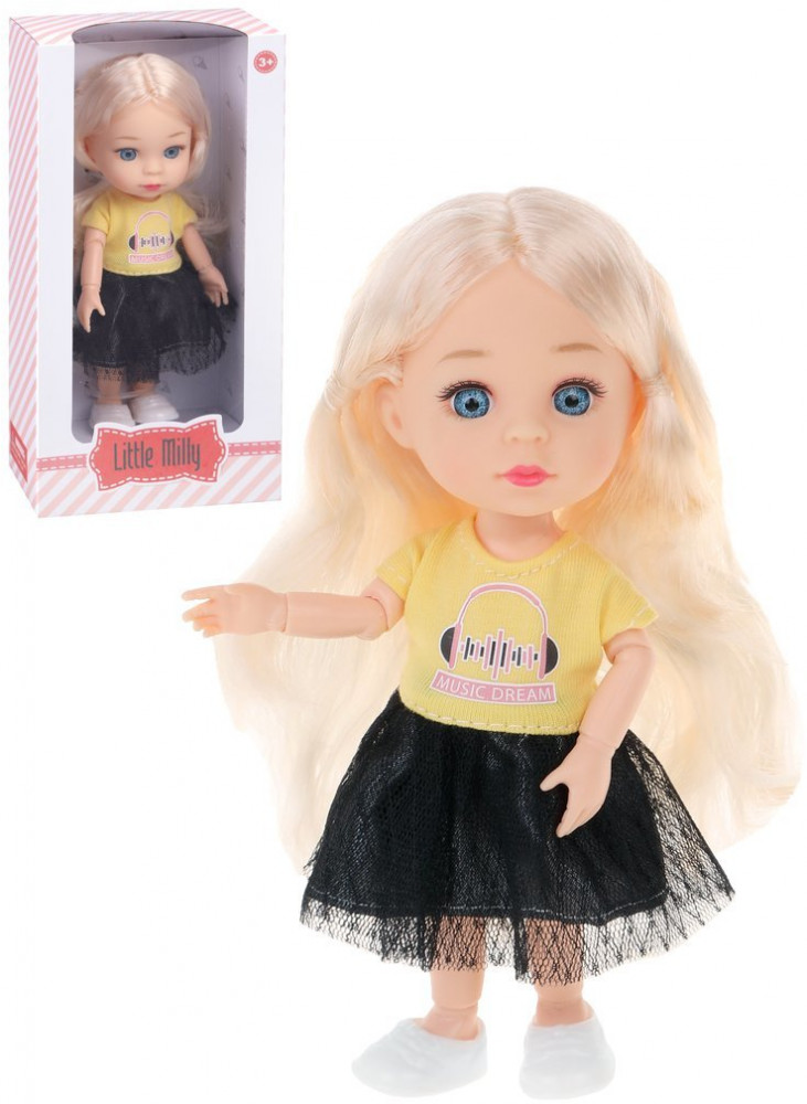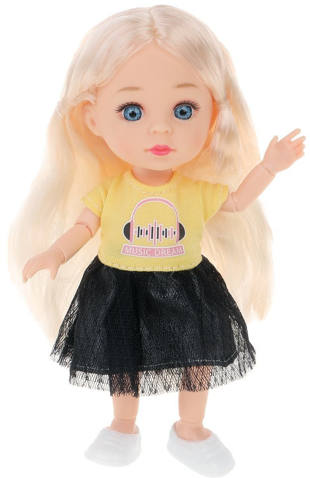 Симпатичная куколка в платье с трикотажным желтым верхом и черной гипюровой юбкой станет для девочки хорошей подружкой. У куклы большие голубые глаза и шелковистые волосы цвета блонд. Шарнирные руки и ноги (8 точек артикуляции) позволяют задавать кукле разные положения для игры. Съемные элементы одежды: платье (застегивается сзади на липучку), туфельки.