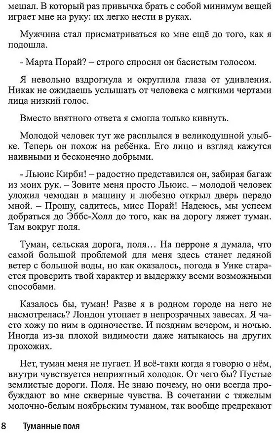 Две недели в доме отдыха Эббс-Холл для Марты Порай должны были стать временем, чтобы полностью избавиться от депрессии и вернуться к обычной жизни. Такой подарок подруги Марта приняла с радостью и, приехав в маленький город на севере Шотландии, облегчённо выдохнула. Внутреннюю уверенность девушки нарушил туман на полях и загадочная тень, которую она заметила по дороге к дому отдыха. Марта не придала тени особого значения. Но таинственная фигура напоминает о себе повсюду и, когда одна из гостей Эббс-Холл умирает ужасной смертью, подозрения Марты падают на тень. Кто скрывается в тумане на полях? |