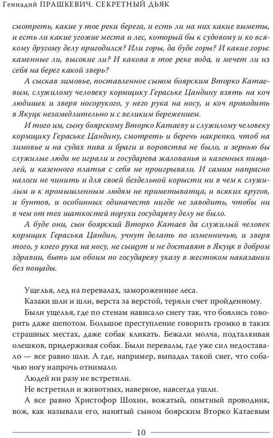 Романы Геннадия Прашкевича можно сравнить с музыкальными произведениями, так необычен ритм его прозы, так самобытен и глобален язык, — отзывались о «Секретном дьяке» и «Носоруком» литературные критики. Гул прошлого явственно доносится до наших дней. Только-только ещё задуман выход к Тихому океану, а приказной дьяк Иван Крестинин со товарищи уже идёт по бескрайним снегам Сибири, преодолевает громадные пространства, освещаемые лишь луной да северными сияниями, слышат гортанные голоса населяющих приполярный круг разноязычных племён; казалось бы, самые обыденные события становятся Историей. «Только что закончил (читать) „Секретного дьяка“, — писал автору, прочитав книгу, Борис Стругацкий. — Отличная вещь! Вы один из поистине немногих в нынешней России, кто умеет писать исторические романы!» |
