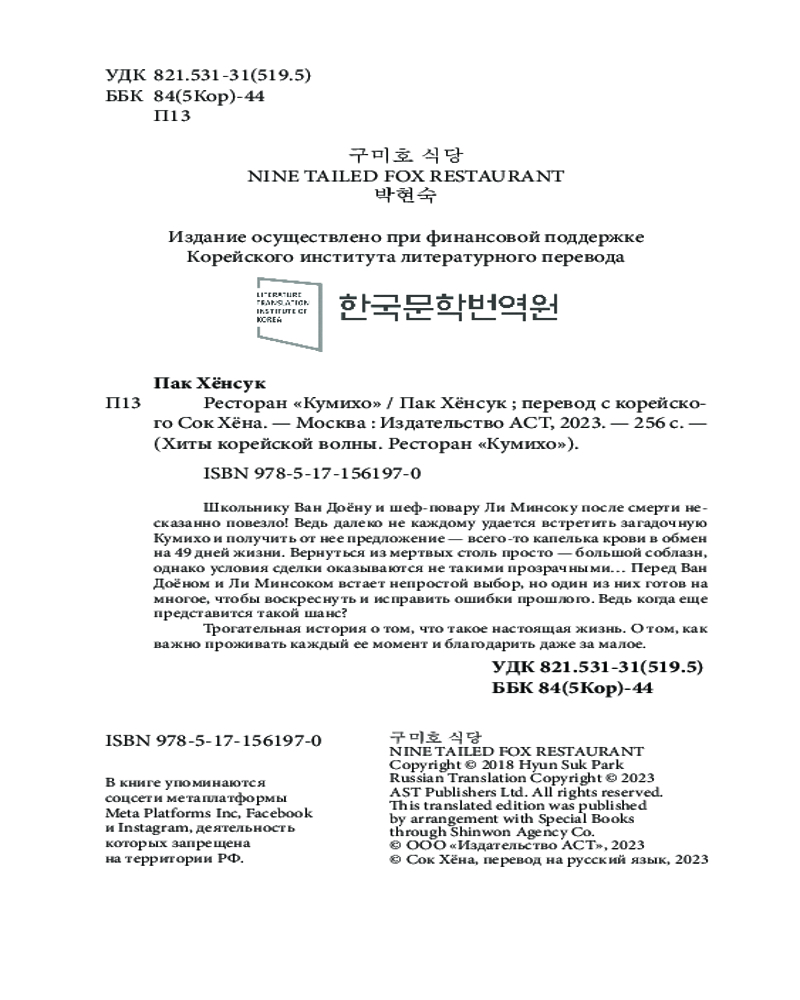 Серия: Хиты корейской волны. Ресторан «Кумихо» Школьнику Ван Доёну и шеф-повару Ли Минсоку после смерти несказанно повезло! Ведь далеко не каждому удается встретить загадочную Кумихо и получить от нее предложение — всего-то капелька крови в обмен на 49 дней жизни. Вернуться из мертвых столь просто — большой соблазн, однако условия сделки оказываются не такими прозрачными... Перед Ван Доёном и Ли Минсоком встает непростой выбор, но один из них готов на многое, чтобы воскреснуть и исправить ошибки прошлого. Ведь когда еще представится такой шанс? |