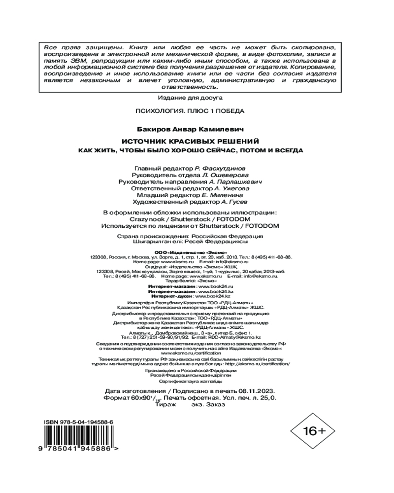 💳 Оплатить за товар можно при получении 🇰🇿 Есть бесплатная доставка по Казахстану 🎁 Копите бонусы с каждой покупки Серия: Психология. Плюс 1 победа (новое оформление, обложка) Жизнь ставит перед нами множество вопросов и проблем: как построить крепкие отношения? как найти работу по душе? как реализовать свой потенциал? как стать счастливым? Удивительно, но большинство ответов — у нас в голове! И эти решения не требуют жертв, невероятной силы воли и ограничений — не нужно терпеть сегодня, чтобы было хорошо завтра. |