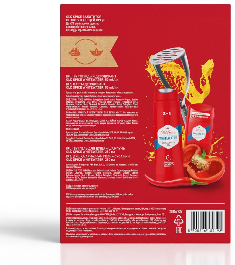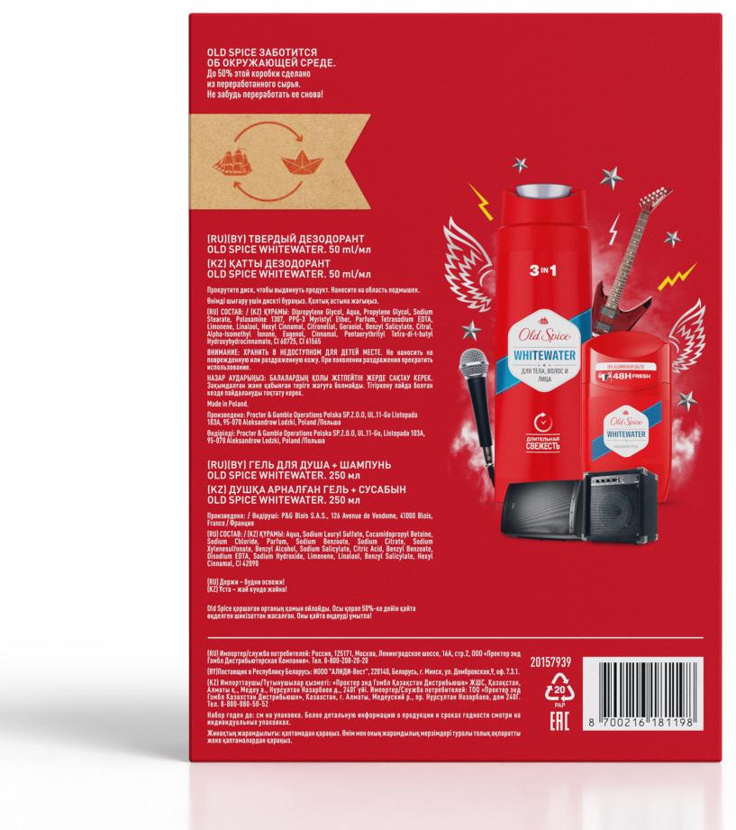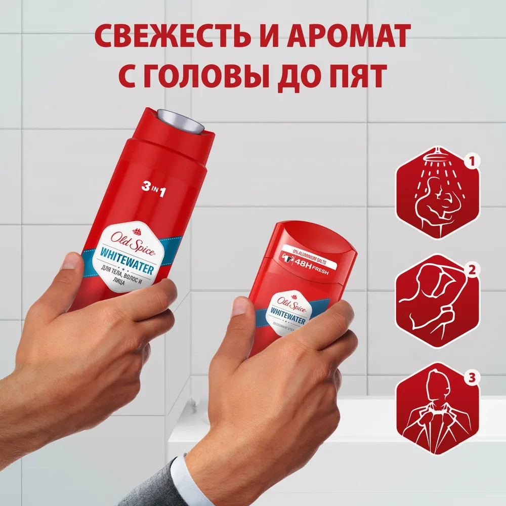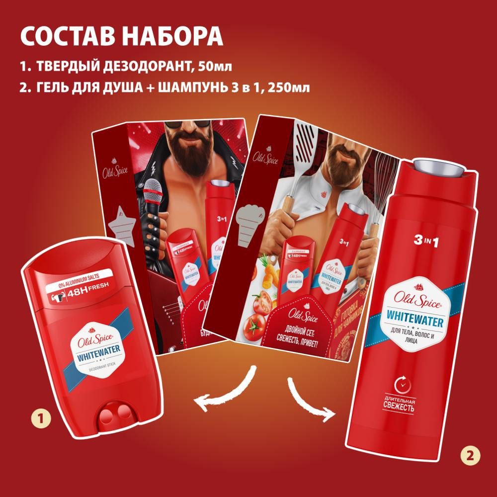 Old Spice Набор подарочный мужской «WhiteWater»В данный момент этот товар отсутствует в продаже. Возможно, у нас найдется аналогичный или похожий товар здесь. Слышите запах? Запах уверенного в себе мужчины. А сейчас? Если всё еще не слышите, набор Old Spice (Олд Спайс) Whitewater – именно то, что нужно вашему мужчине. Мужской набор Old Spice Whitewater включает в себя гель для душа + шампунь 3в1 250 мл и дезодорант-стик 50 мл. Ничего лишнего. Мужественная классика. Как фильмы из 90-х. Освежающая пена геля для душа, как волной, смоет всё лишнее, а твёрдый дезодорант с верхними нотами лимона и лайма даст заряд свежести на целый день и поможет мужчине быть уверенным в каждом шаге, в каждом выдохе и вдохе. Разжигать или тушить пожары, — с Old Spice Whitewater мужчина может делать что захочет. |
