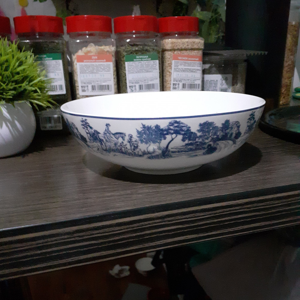 Тарелочка отличная! Фарфор,скорее всего костяной. Она достаточно большая, почему- то думала ,что диаметр 19 см будет поменьше. Поэтому ее можно использовать и как салатник. Но мы взяли , как суповую . Планируем взять еще одну.