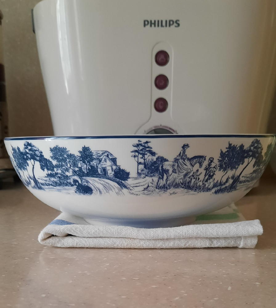 Нормальная суповая тарелка.Мои, классической формы перестали устраивать, ибо приходится наливать в ровень с краями и потом горячо нести раскалённую из микроволновки. В эту же можно налить 2/3 объема, если кому то кажется, что она большая. Мне как раз норм. Есть у меня чайный набор с похожим рисунком, поэтому тарелочка понравилась сразу, как увидела. Так же, хорошо, что можно мыть в посудомойке.