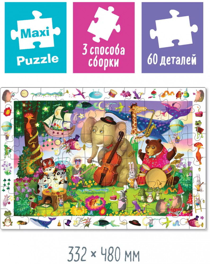 Пазл «С днём рождения»В данный момент этот товар отсутствует в продаже. Возможно, у нас найдется аналогичный или похожий товар здесь. Серия: IQ пазлы картонные Увлекательная головоломка и игра на внимание в подарочном сундучке. Яркая картинка с изображением весёлых животных собирается из 60 деталей. Элементы пазла выполнены из плотного кашированного картона. Каждая деталь имеет уникальную вырубку, благодаря чему пазл можно собирать с обратной стороны (методом слепой сборки). Размер готового пазла 320×480 мм. Собрав пазл, можно сыграть в игру на внимание. На рамке вокруг картинки изображены различные предметы. Задача — найти их на картинке. Занятие с пазлами будет способствовать развитию мелкой моторики, усидчивости, восприятия, внимания и пространственного мышления. IQ Пазл с развивающей игрой будет отличным и полезным подарком как для мальчика, так и для девочки. |