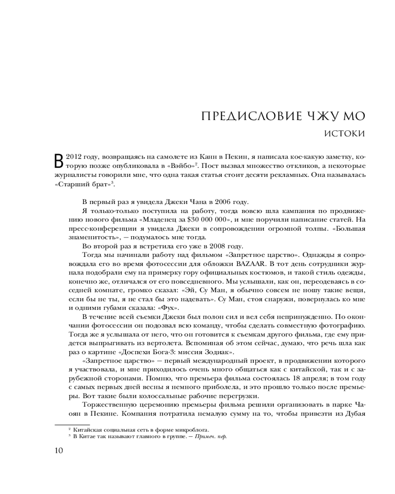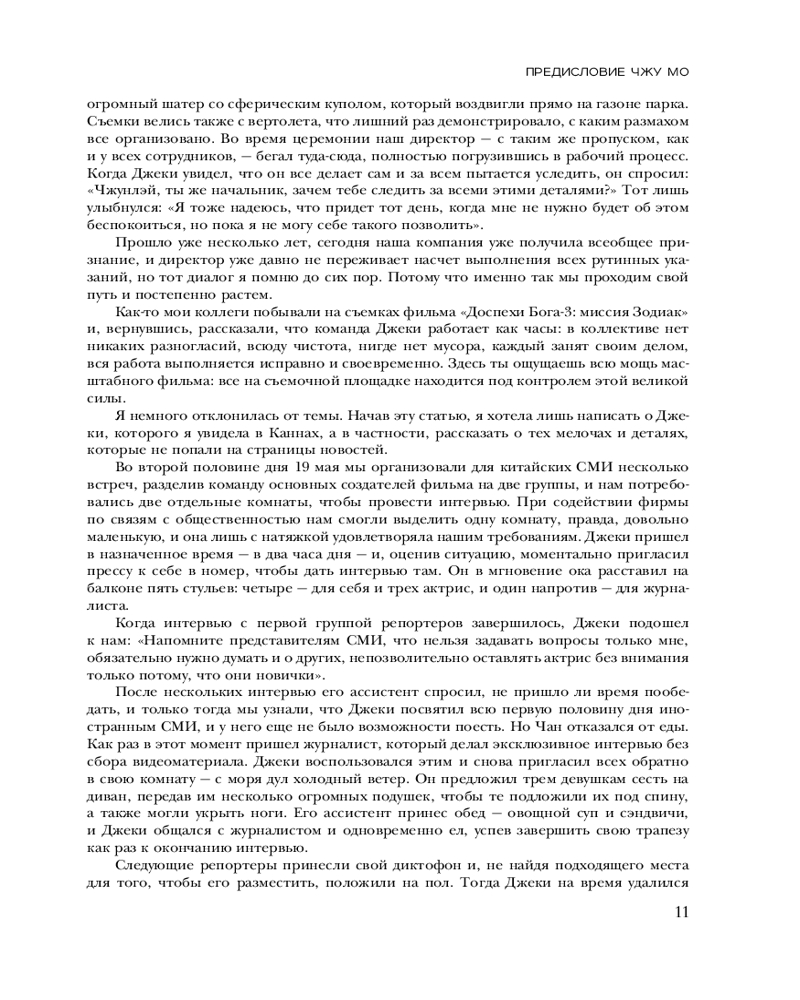 Возможно, этих ярких историй читатель никогда бы не увидел, если бы Чжу Мо, подруга Джеки Чана, однажды не предложила ему: «А давай сделаем книгу?» В течение трех лет Чжу Мо ежедневно записывала его воспоминания и приводила в логический порядок, добавляя к ним свои личные истории о работе с кумиром миллионов людей.