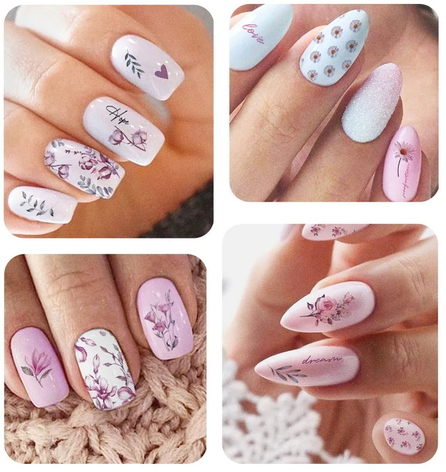 Деньги на ветер: при переводе на ноготь обратная сторона изображения очень блеклая, белёсая, рисунок цветка не просматривается, в результате все картинки с цветами можно выкинуть, максимум что можно использовать со всего листа - это надписи и сердечки