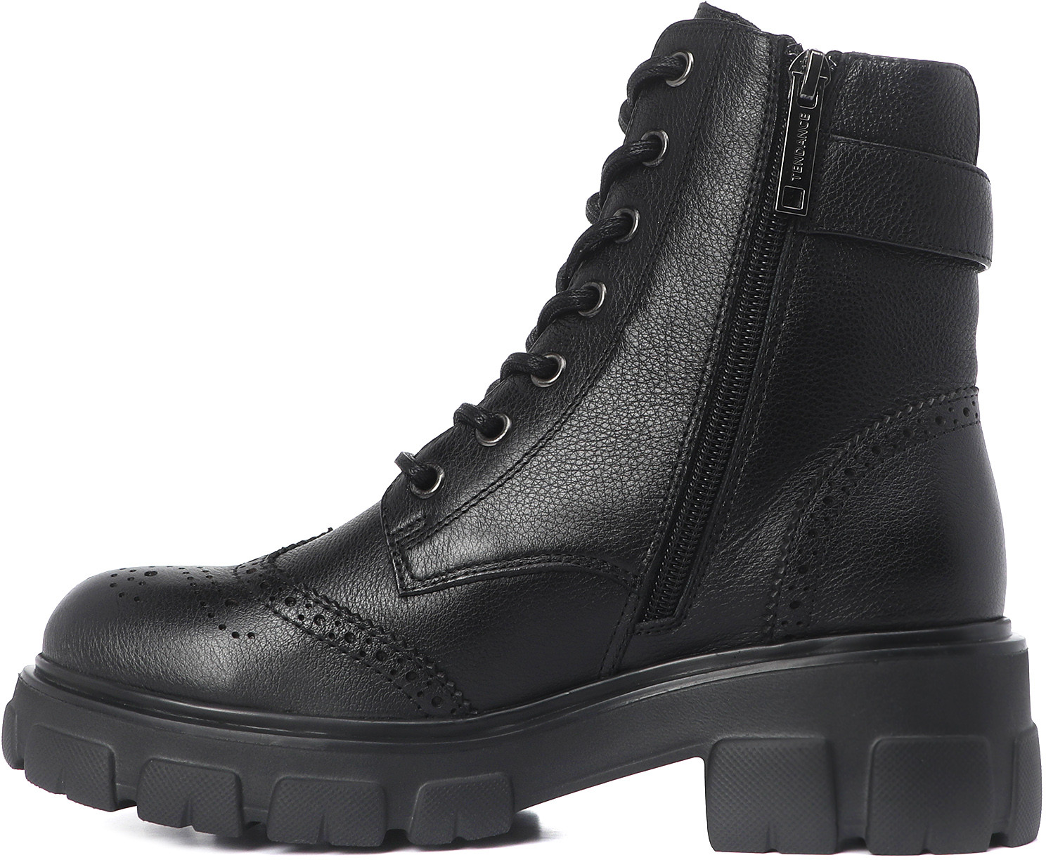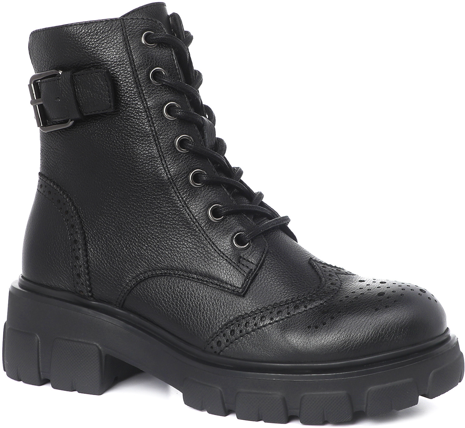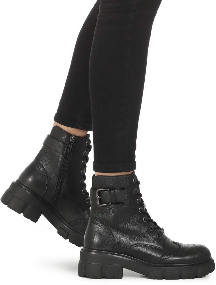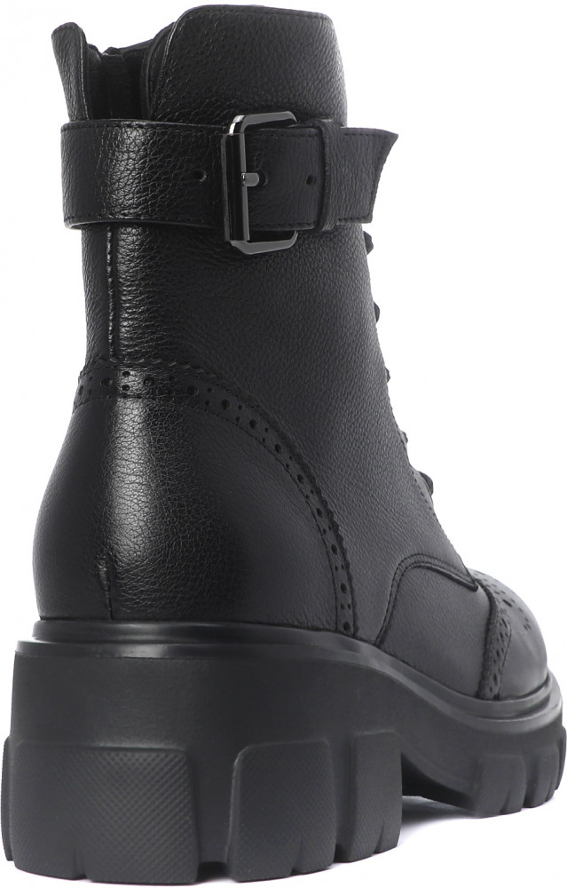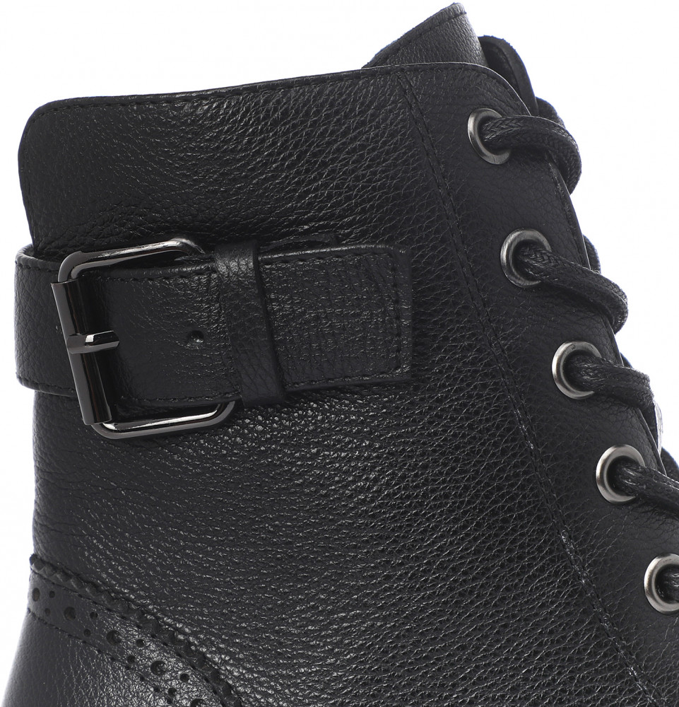 Верх модели выполнен из натуральной кожи теленка с зернистой обработкой материала верха. Стелька из натуральной кожи безопасна для стопы и препятствует появлению мозолей. Материал позволит ногам дышать и меньше потеть. Резиновая подошва обеспечивает отличное сцепление с поверхностью и хорошую амортизацию. Толщина подошвы — 2,5 см. Способ соединения подошвы — клеевой. Высота обуви — 14 см, объем голенища — 20 см.