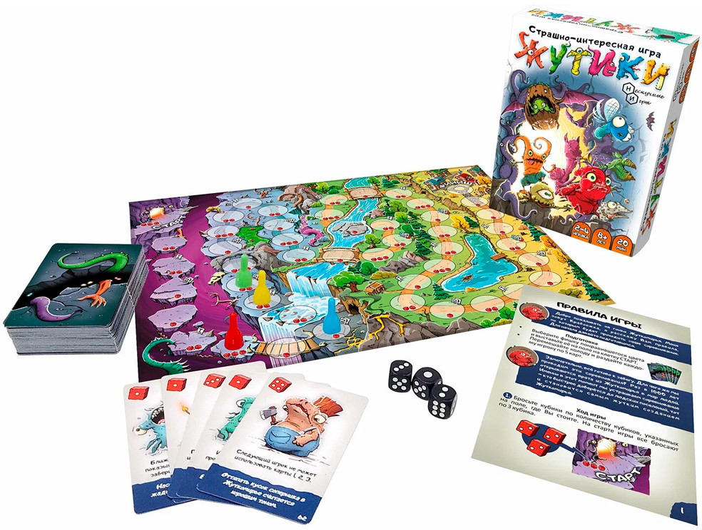 Нескучные игры Игра настольная «Жутики»В данный момент этот товар отсутствует в продаже. Возможно, у нас найдется аналогичный или похожий товар здесь. Настольная игра «Жутики» от издательства «Нескучные игры» Цель игры Первым добраться до людских поселений и стать самым жутким созданием Жуткомирья. В двух словах Врата Жуткомирья наконец-то открыты! Такое бывает лишь раз в 1000 лет. И теперь жутко милые жители других измерений устраивают соревнование: кто быстрее всех доберется до людских поселений и будет первым пугать людей. «Жутики» — игра-бродилка, участники которой бросают кубики, берут карточки, двигаются по полю и применяют выпавшие свойства. Кто первым доберется до финиша, тот и станет главным жутиком. Игра «Жутики» от издательства «Нескучные игры» подходит для 2-4 игроков. Интересные факты «Жутики» отличается от классических бродилок наличием карточек со свойствами, которые делают игру более динамичной. |