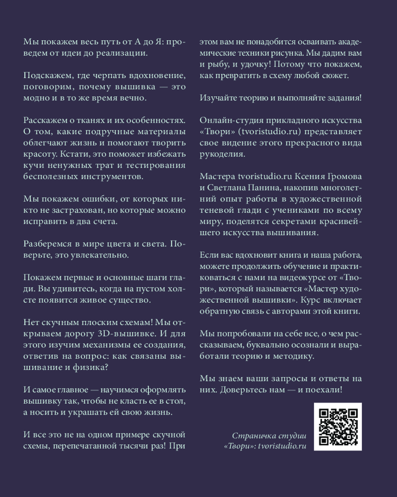 Светлана Панина и Ксения Громова — мастера студии художественной глади tvoristudio.ru, авторы бестселлера по вышиванию, накопив многолетний опыт работы и преподавания художественной теневой глади ученикам по всему миру, поделятся секретами красивейшего искусства вышивания гладью в современной интерпретации!