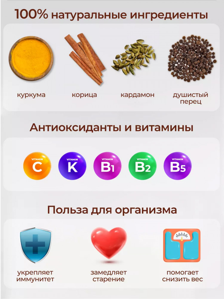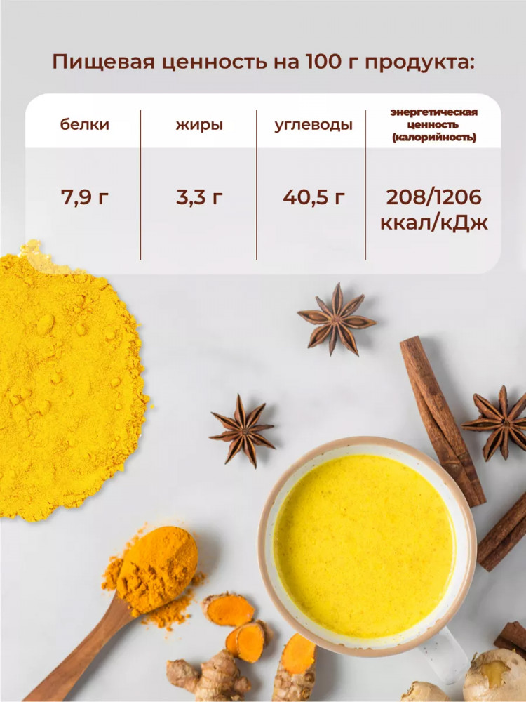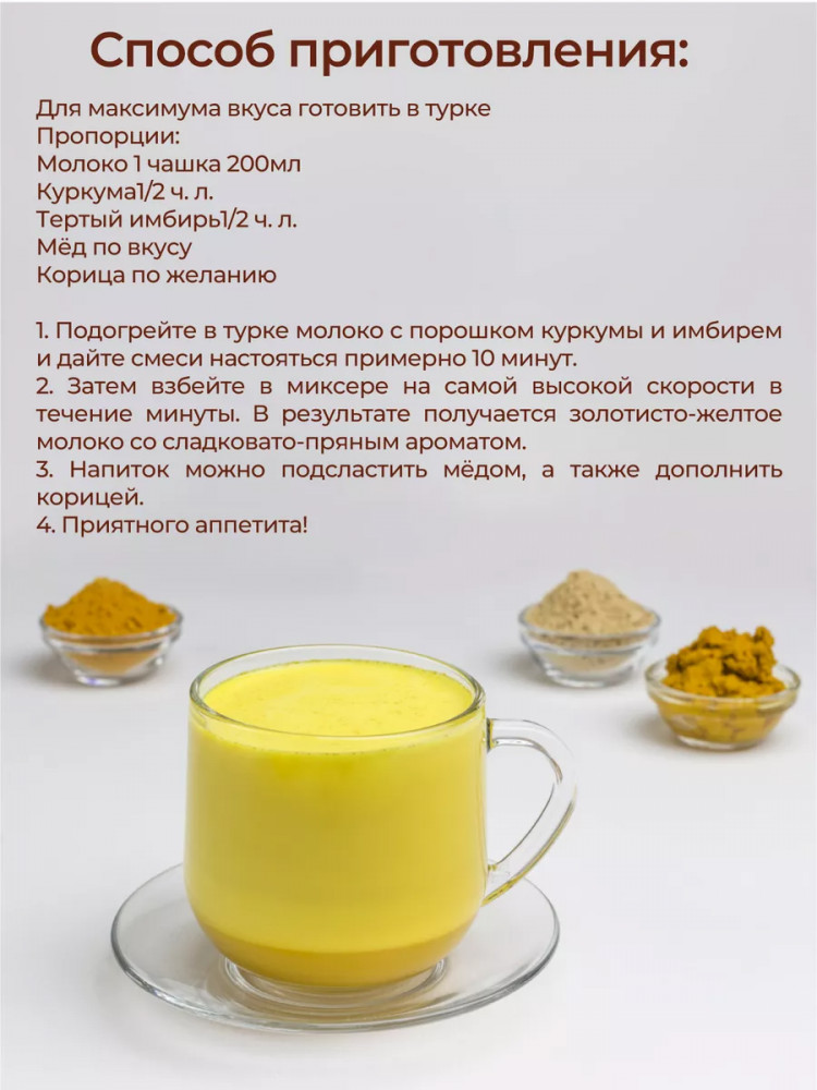 Куркума латте — знаменитая смесь специй и пряностей для приготовления напитка «Золотое молоко». Этот коктейль получил свое признание благодаря многочисленным полезным свойствам, в котором используются только натуральные ингредиенты: корица молотая, куркума, перец душистый, кардамон молотый. |