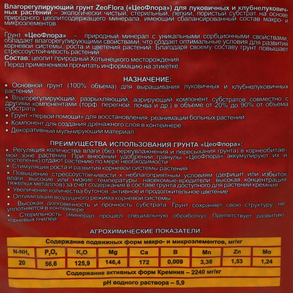 В данный момент этот товар отсутствует в продаже. Возможно, у нас найдется аналогичный или похожий товар здесь. Основа продукции ZeoFlora («ЦеоФлора») — хотынецкий цеолит. Использование цеолитов в цветоводстве позволяет снизить заболеваемость растений, улучшить их выживаемость, существенно увеличить количество бутонов и скорость роста растений, а в конечном итоге — получить цветочную продукцию более высокого качества. Цеолит — уникальный природный минерал, который способен поглощать, прочно удерживать в своей структуре, обменивать и отдавать частицы различных веществ, пролонгировать действие питательных веществ, минеральных удобрений.
