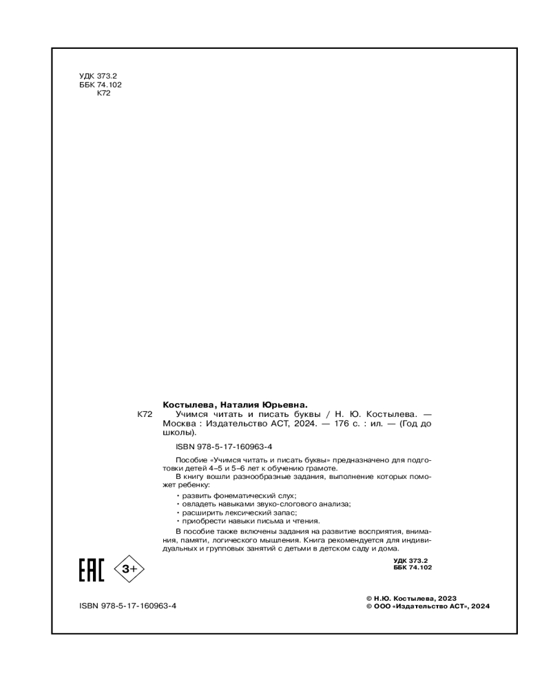 Серия: Год до школы Пособие «Учимся читать и писать буквы» предназначено для подготовки детей 4-5 и 5-6 лет к обучению грамоте. В пособие также включены задания на развитие восприятия, внимания, памяти, логического мышления.Книга рекомендуется для индивидуальных и групповых занятий с детьми в детском саду и дома. |