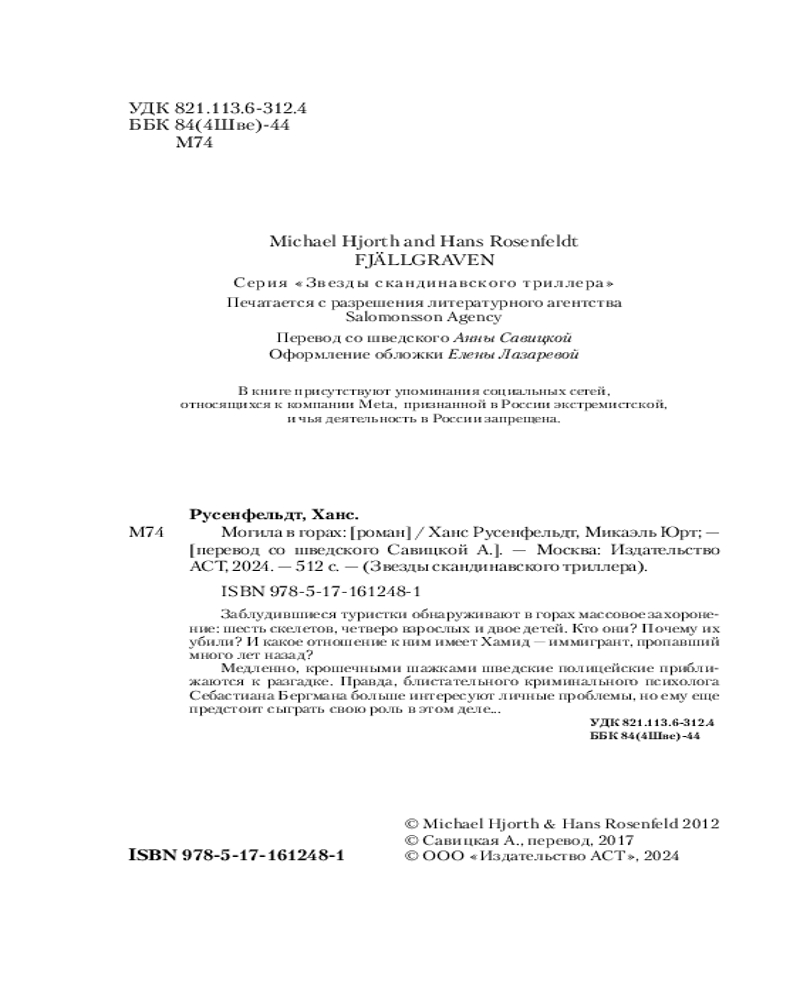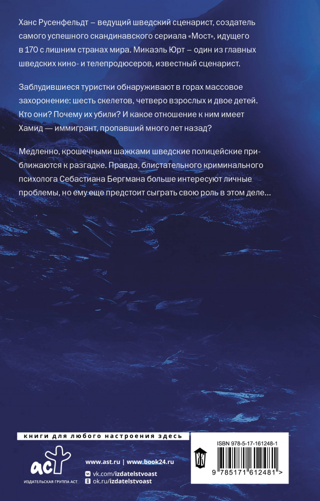 Могила в горахВ данный момент этот товар отсутствует в продаже. Возможно, у нас найдется аналогичный или похожий товар здесь. Серия: Звезды скандинавского триллера Заблудившиеся туристки обнаруживают в горах массовое захоронение: шесть скелетов, четверо взрослых и двое детей. Кто они? Почему их убили? И какое отношение к ним имеет Хамид — иммигрант, пропавший много лет назад? Медленно, крошечными шажками шведские полицейские приближаются к разгадке. Правда, блистательного криминального психолога Себастиана Бергмана больше интересуют личные проблемы, но ему еще предстоит сыграть свою роль в этом деле... |