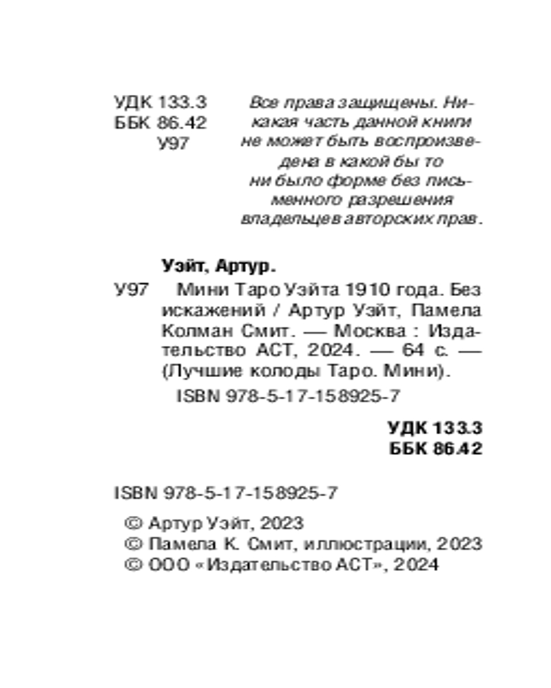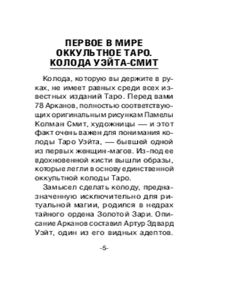 В этом издании названия карт даны на английском языке, как задумал их Артур Уэйт. Все иллюстрации авторства Памелы Смит и печатаются без искажений. Вместе с колодой вы найдете небольшое руководство с рекомендациями и раскладами от самого великого мастера Таро. Карты ответят на любые вопросы, дадут возможность заглянуть в будущее, разобраться в себе и своем окружении. Колода отлично подходит как для начинающих, так и для профессиональных тарологов.