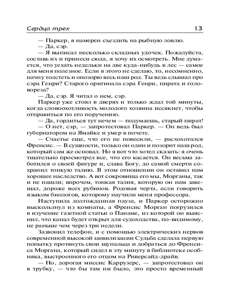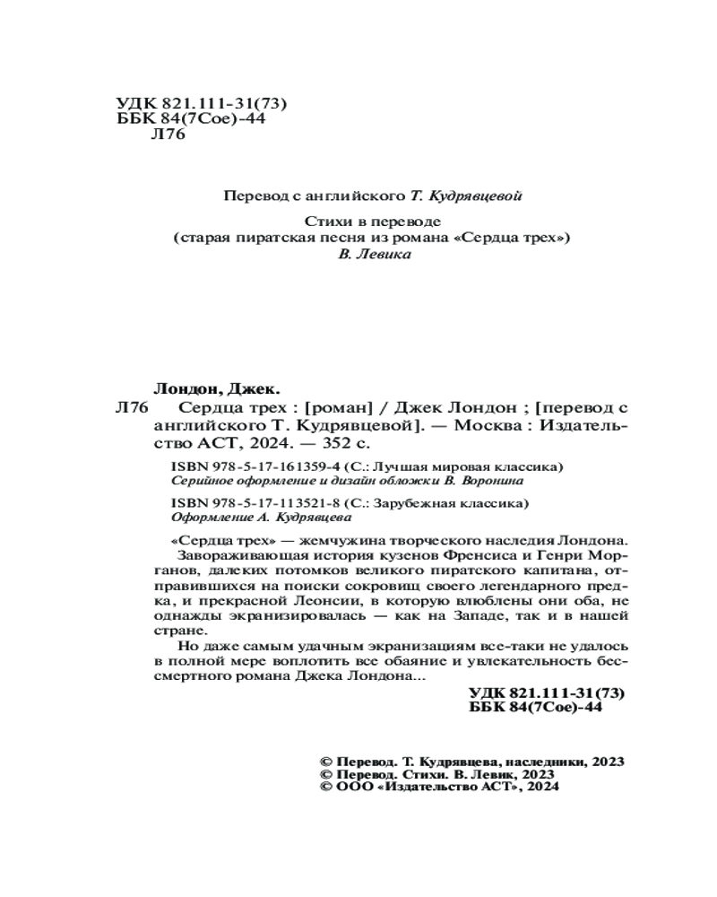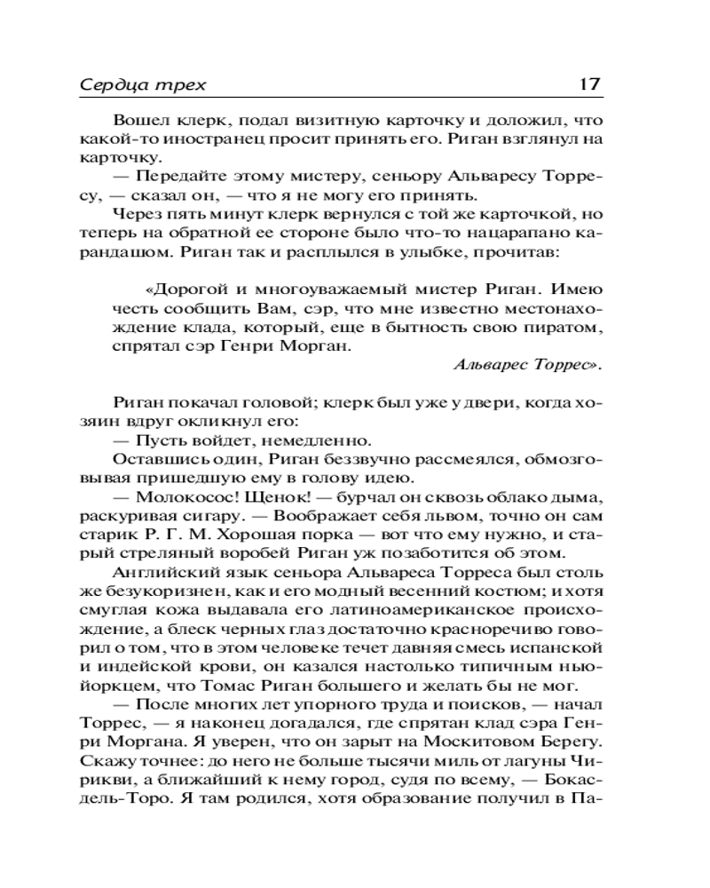Серия: Лучшая мировая классика «Сердца трех» — жемчужина творческого наследия Лондона. Завораживающая история кузенов Френсиса и Генри Морганов, далеких потомков великого пиратского капитана, отправившихся на поиски сокровищ своего легендарного предка, и прекрасной Леонсии, в которую влюблены они оба, не однажды экранизировалась — как на Западе, так и в нашей стране. Но даже самым удачным экранизациям все-таки не удалось в полной мере воплотить все обаяние и увлекательность бессмертного романа Джека Лондона... |