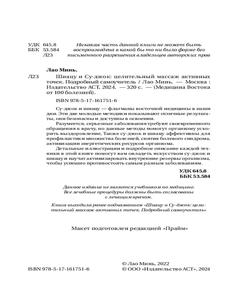 💳 Оплатить за товар можно при получении 🇰🇿 Есть бесплатная доставка по Казахстану 🎁 Копите бонусы с каждой покупки Серия: Медицина Востока от 100 болезней В этой книге представлены две классические методики медицины Востока — су-джок и шиацу. Это относительно молодые практики, но именно они стали самыми популярными в мире благодаря своей эффективности. Метод су-джок пришел к нам из Кореи. Название говорит само за себя: «су» переводится как кисть, ладонь, «джок» — нога. Именно на эти зоны и предлагается воздействовать, используя принцип подобия. Метод шиацу, название которого можно перевести как «надавливание пальцами», берет свое начало от китайского массажа амма, что означает «успокоение рукой». Гармонизация энергии, просветление организма — вот на что нацелена эта практика, и именно это приводит к оздоровлению. |