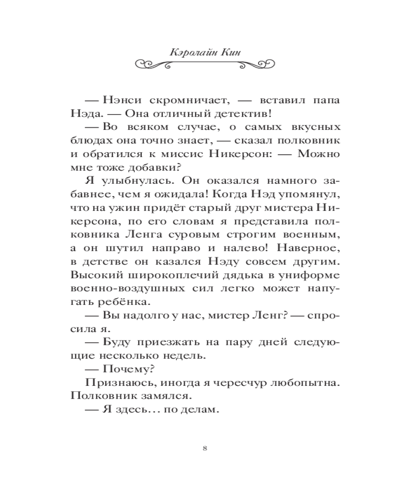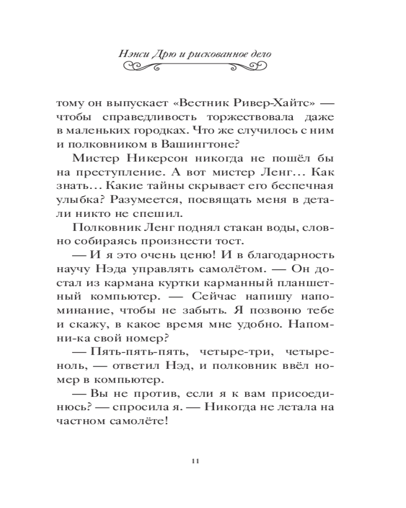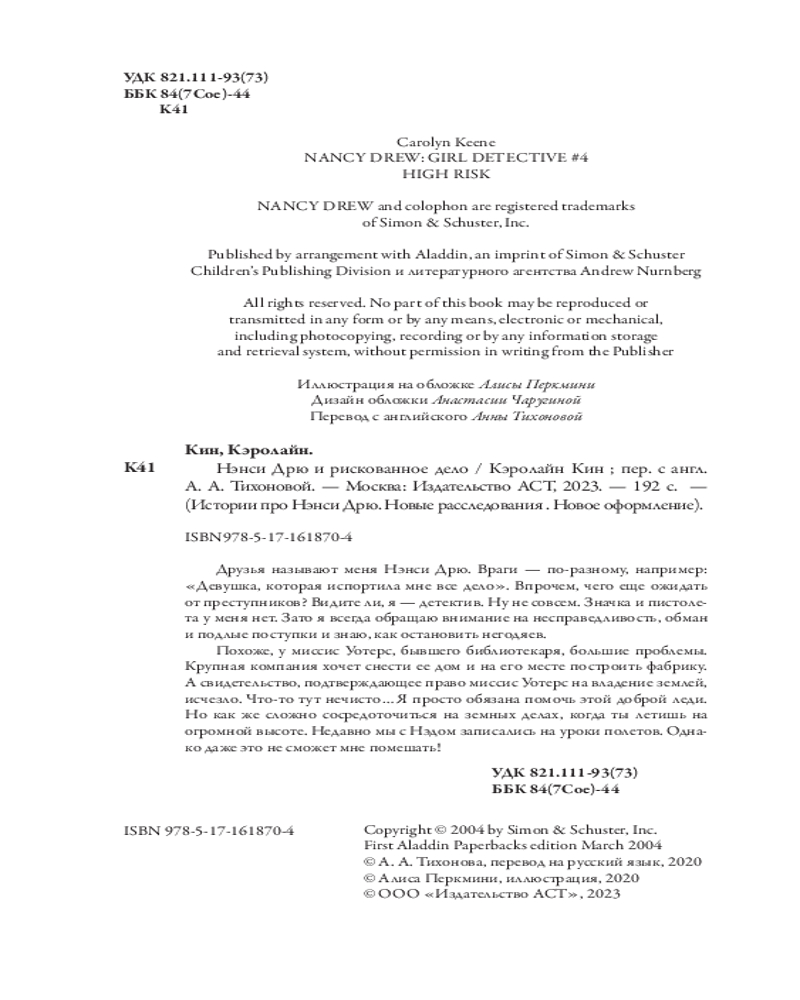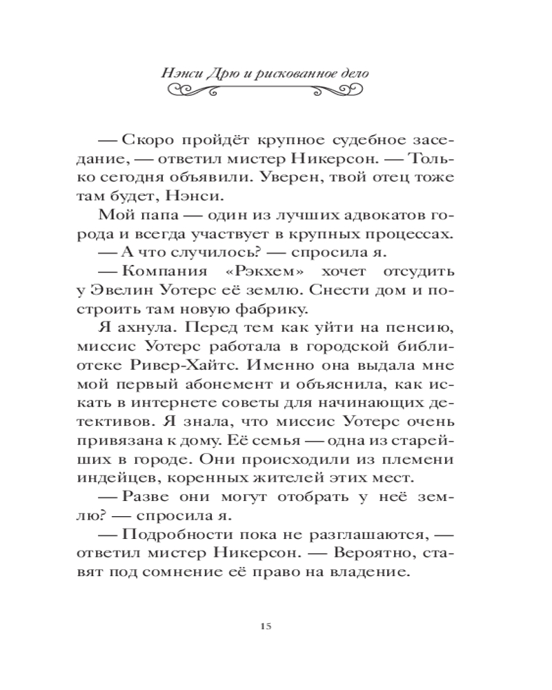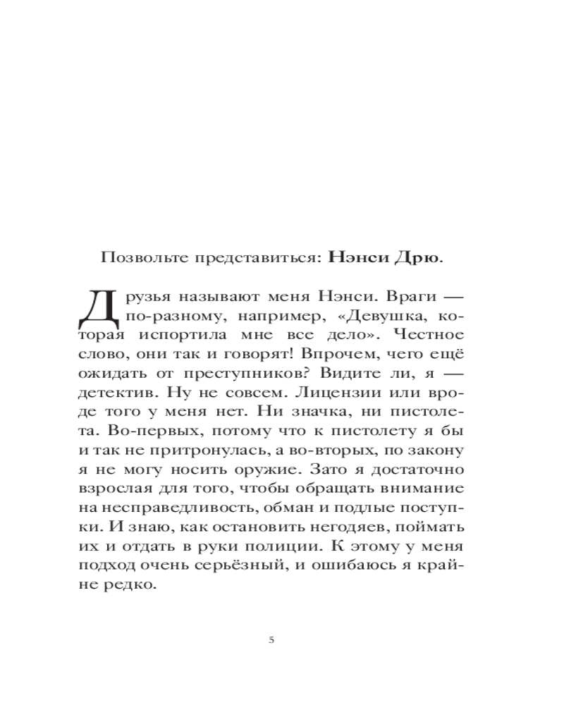 Серия: Истории про Нэнси Дрю. Новые расследования. Новое оформление Друзья называют меня Нэнси Дрю. Враги — по-разному, например: «Девушка, которая испортила мне все дело». Впрочем, чего еще ожидать от преступников? Видите ли, я — детектив. Ну не совсем. Значка и пистолета у меня нет. Зато я всегда обращаю внимание на несправедливость, обман и подлые поступки и знаю, как остановить негодяев. |