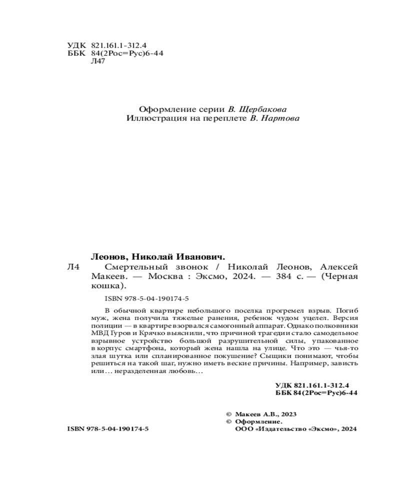 Смертельный звонокАлексей Викторович Макеев, Николай Иванович Леонов В данный момент этот товар отсутствует в продаже. Возможно, у нас найдется аналогичный или похожий товар здесь. Серия: Черная кошка В обычной квартире небольшого поселка прогремел взрыв. Погиб муж, жена получила тяжелые ранения, ребенок чудом уцелел. Версия полиции — в квартире взорвался самогонный аппарат. Однако полковники МВД Гуров и Крячко выяснили, что причиной трагедии стало самодельное взрывное устройство большой разрушительной силы, упакованное в корпус смартфона, который жена нашла на улице. Что это — чья-то злая шутка или спланированное покушение? Сыщики понимают, чтобы решиться на такой шаг, нужно иметь веские причины. Например, зависть или... неразделенная любовь... |