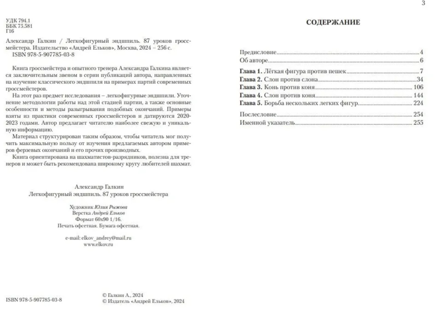 Книга гроссмейстера и опытного тренера Александра Галкина является заключительным звеном в серии публикаций автора, направленных на изучение классического эндшпиля на примерах партий современных гроссмейстеров. На этот раз предмет исследования — легкофигурные эндшпили. Уточнение методологии работы над этой стадией партии, а также основные особенности и методы разыгрывания подобных окончаний. Примеры взяты из практики современных гроссмейстеров и датируются 2020-2023 годами. Автор предлагает читателю наиболее свежую и уникальную информацию. Материал структурирован таким образом, чтобы читатель мог получить максимальную пользу от изучения предлагаемых автором примеров ферзевых окончаний и его прочих производных. Книга ориентирована на шахматистов-разрядников, полезна для тренеров и может быть рекомендована широкому кругу любителей шахмат. |