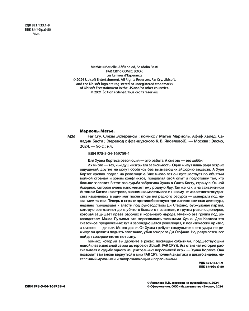 Комикс, который вы держите в руках, посвящен событиям, предшествующим новой главе звездной серии шутеров от Ubisoft, FAR CRY 6. Эта отвязная история рассказывает о судьбе одного из центральных персонажей игры Хуана Кортеса. Она позволит вам вновь вернуться в мир FAR CRY, полный экзотики и дикого экшена, населенный мрачными и завораживающими персонажами. |