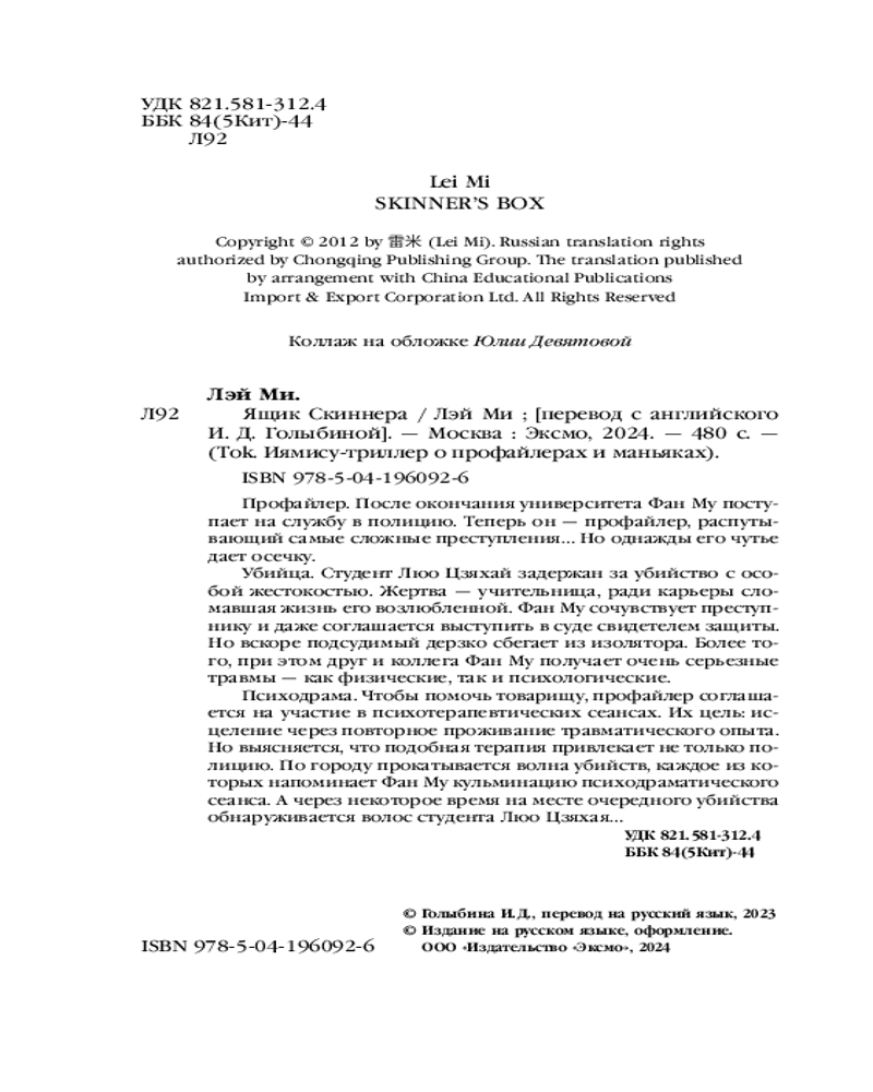 Серия: Tok. Иямису-триллер о профайлерах и маньяках (обложка с клапанами) Профайлер. После окончания университета Фан Му поступает на службу в полицию. Теперь он — профайлер, распутывающий самые сложные преступления... Но однажды его чутье дает осечку. Убийца. Студент Люо Цзяхай, задержан за убийство с особой жестокостью. Жертва — учительница, ради карьеры сломавшая жизнь его возлюбленной. Фан Му сочувствует преступнику и даже соглашается выступить в суде свидетелем защиты. Но вскоре подсудимый дерзко сбегает из изолятора. Более того: при этом друг и коллега Фан Му получает очень серьезные травмы — как физические, так и психологические. |