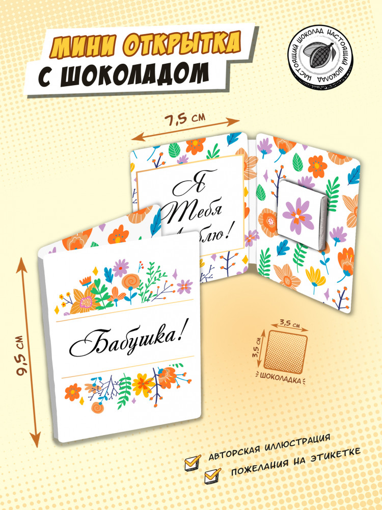 ChokoCat Открытка с шоколадом «Бабушка»В данный момент этот товар отсутствует в продаже. Возможно, у нас найдется аналогичный или похожий товар здесь. Серия: Mini открытки Сколько тепла и любви в этом слове, люблю тебя, бабушка. Для комплимента не нужен особый повод, достаточно шоколадки. Мини-открытка — это отличное дополнение для букета или подарка. Способна заменить признание в любви, извинения или просто поднять настроение. Внутри молочный шоколад в индивидуальной этикетке. |