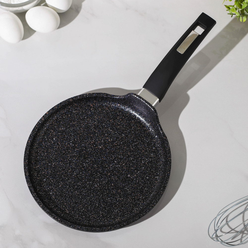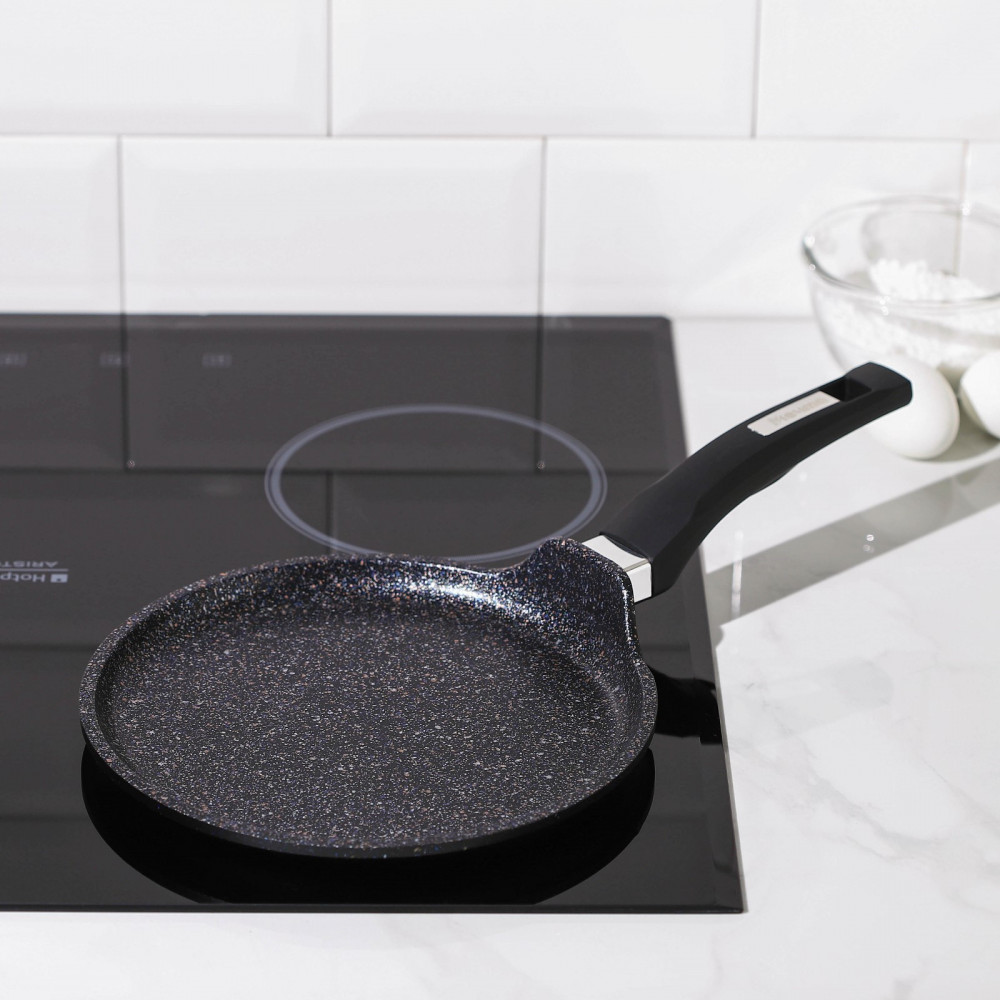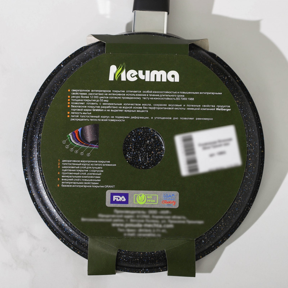 Серия: Гранит Star Сковороды серии Granite выполнены из прочного литого алюминия. Посуде не страшна деформация под воздействием высокой температуры, изделие прочное и лёгкое. Отличительная черта посуды Granite — усиленное кристаллами минералов антипригарное покрытие Greblon, разработанное немецкой компанией Weiburger Coatings. Оно защищает от пригорания, позволяет экономить масло и не выделяет вредных веществ. Также покрытие имеет высокую износостойкость — более 12 тысяч циклов мойки. Нагрев поверхности более быстрый, чем у чугунной и стальной посуды. Утолщённое дно — до 6 мм. Можно мыть в посудомоечных машинах. Сковороду можно использовать на газовых, электрических, стеклокерамических и галогенных плитах. |