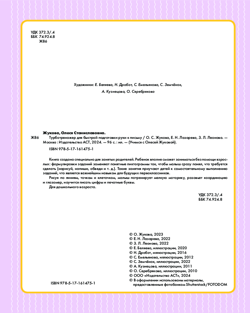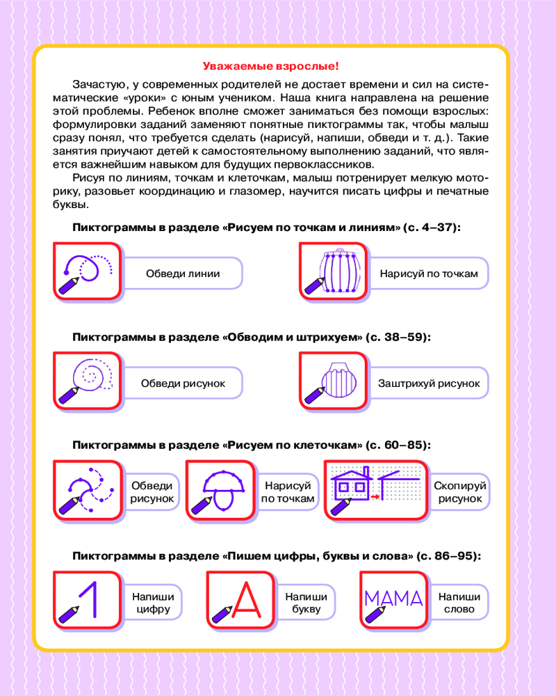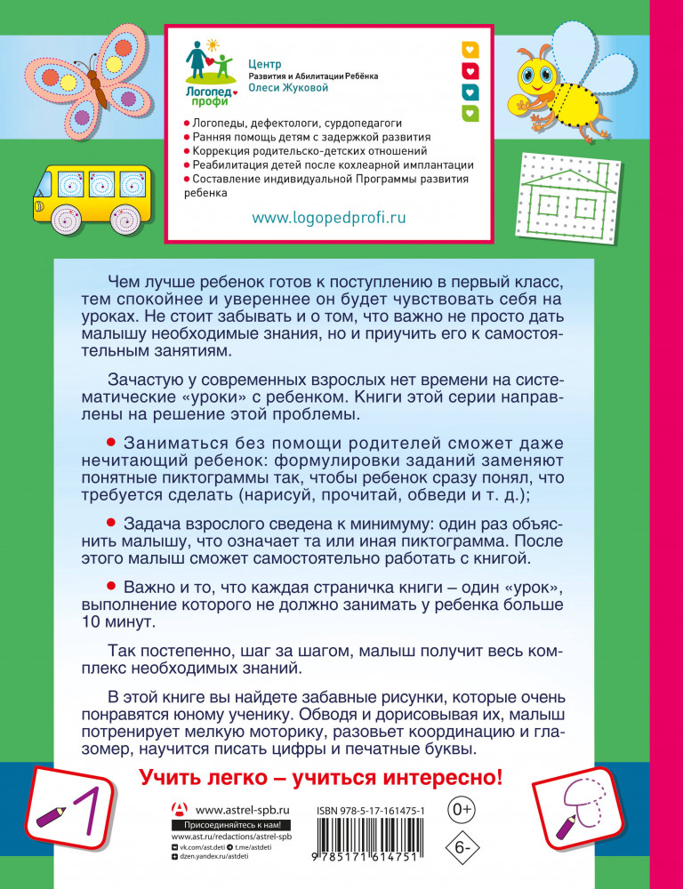 Турботренажер для быстрой подготовки руки к письмуЕлена Николаевна Лазарева, Олеся Станиславовна Жукова, Зоя Леонидовна Леонова В данный момент этот товар отсутствует в продаже. Возможно, у нас найдется аналогичный или похожий товар здесь. Серия: Учимся с Олесей Жуковой Книга создана специально для занятых родителей. Ребенок вполне сможет заниматься без помощи взрослых: формулировки заданий заменяют понятные пиктограммы так, чтобы малыш сразу понял, что требуется сделать (нарисуй, напиши, обведи и т. д.). Такие занятия приучают детей к самостоятельному выполнению заданий, что является важнейшим навыком для будущих первоклассников. |