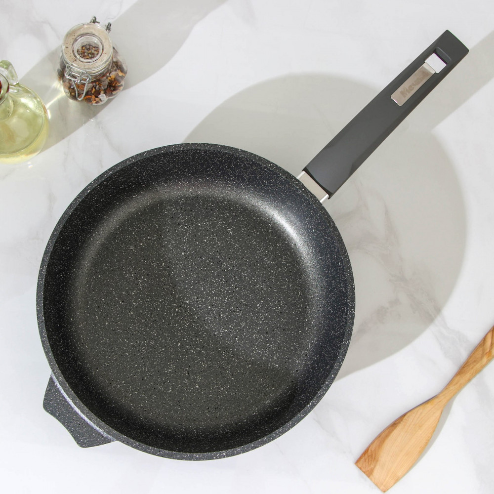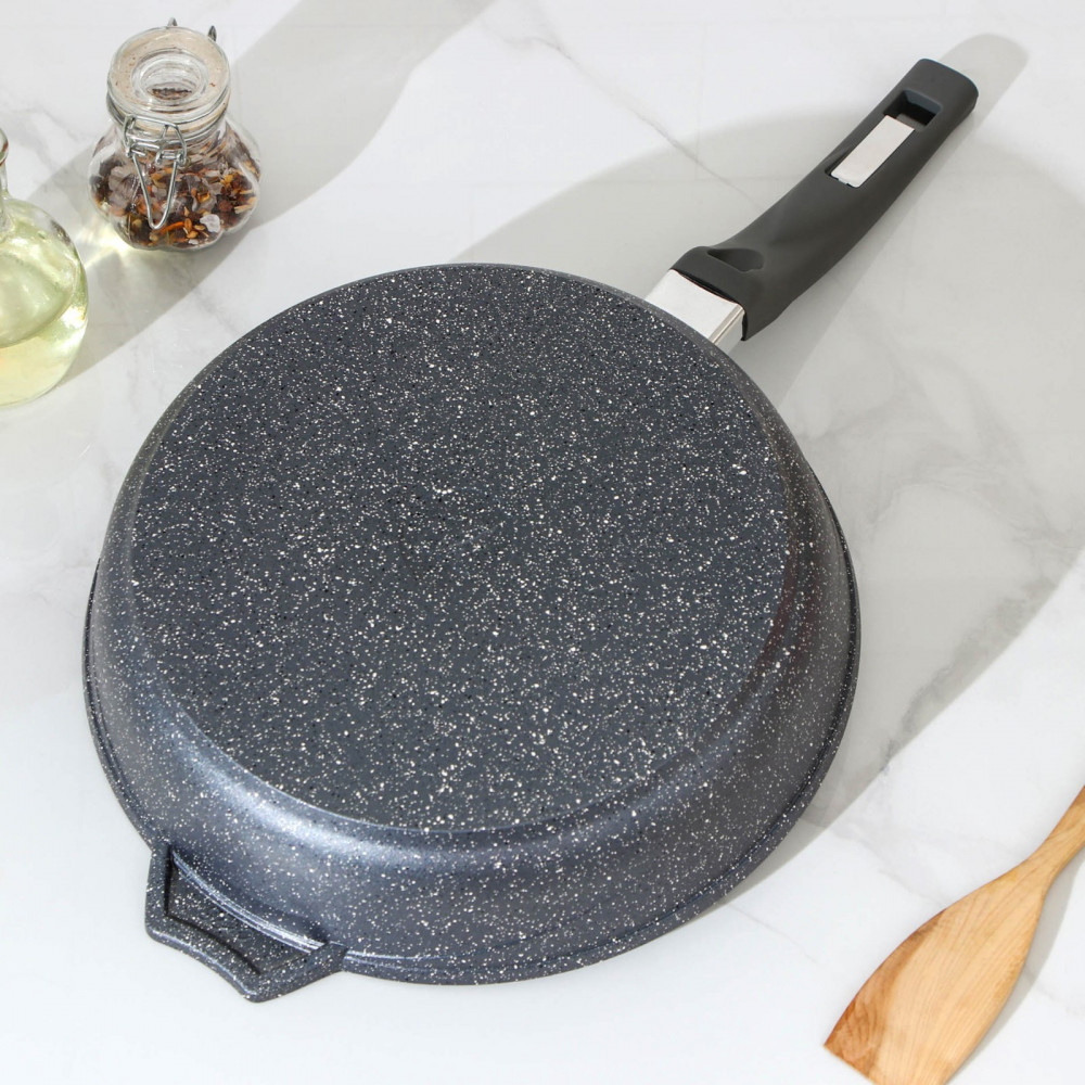 Сковорода линии Гранит с антипригарным покрытием, которое является полностью безвредным для здоровья при готовке ваших любимых блюд. Сковорода подходит для всех видов плит, кроме индукционных, изготовлена из прочного и легкого сплава пищевого алюминия. Это один из самых высококачественных и экологических материалов для производства посуды, обладает высокой тепловой проводимостью и обеспечивает равномерный нагрев.