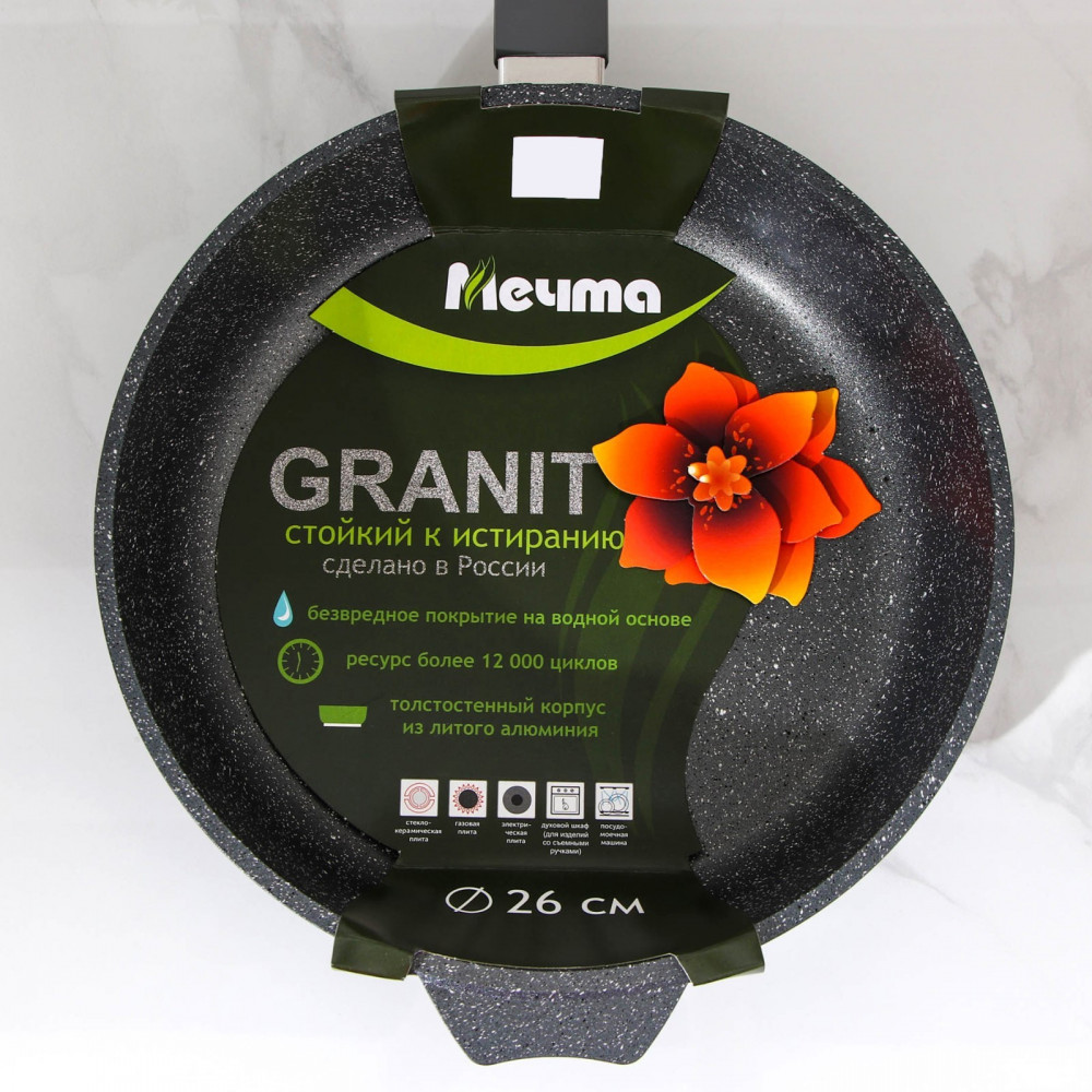 Сверхпрочное антипригарное покрытие отличается особой износостойкостью и превосходными антипригарными свойствами, рассчитано на интенсивное использование в течение длительного срока. Дно и стенки сковороды не подвержены деформации, царапинам и сколам за счет применения особой технологии производства. Посуда линейки Гранит подходит для мытья в посудомоечной машине (согласно инструкции по эксплуатации). Посуда торговой марки Мечта — это приятный и практичный подарок для любого случая!