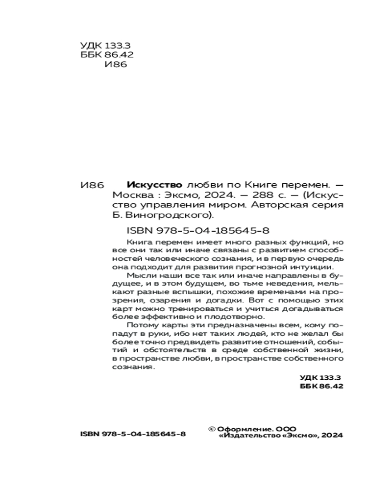 Серия: Искусство управления миром. Авторская серия Б. Виногродского Уникальная авторская колода Бронислава Виногродского для гадания по Книге Перемен на тему любовных отношений. «Карты эти предназначены всем, кому попадут в руки, ибо нет таких людей, кто не желал бы более точно предвидеть развитие отношений, событий и обстоятельств в среде собственной жизни, в пространстве любви, в пространстве собственного сознания», — пишет автор. |