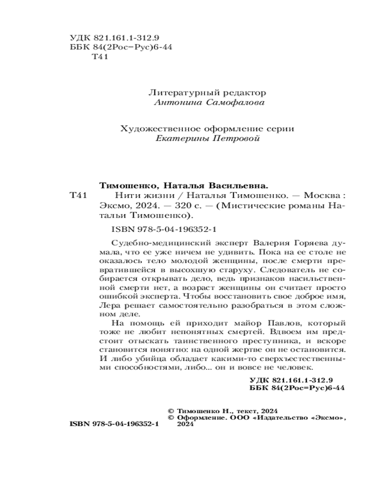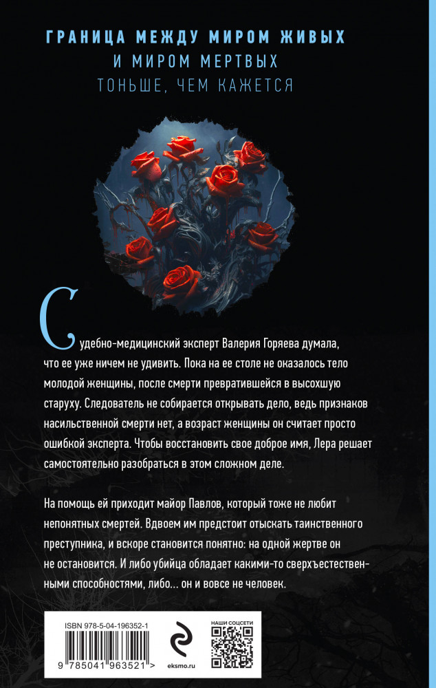 Судебно-медицинский эксперт Валерия Горяева думала, что ее уже ничем не удивить. Пока на ее столе не оказалось тело молодой женщины, после смерти превратившейся в высохшую старуху. Следователь не собирается открывать дело, ведь признаков насильственной смерти нет, а возраст женщины он считает просто ошибкой эксперта. Чтобы восстановить свое доброе имя, Лера решает самостоятельно разобраться в этом сложном деле. На помощь ей приходит майор Павлов, который тоже не любит непонятных смертей. Вдвоем им предстоит отыскать таинственного преступника, и вскоре становится понятно: на одной жертве он не остановится. И либо убийца обладает какими-то сверхъестественными способностями, либо... он и вовсе не человек. |