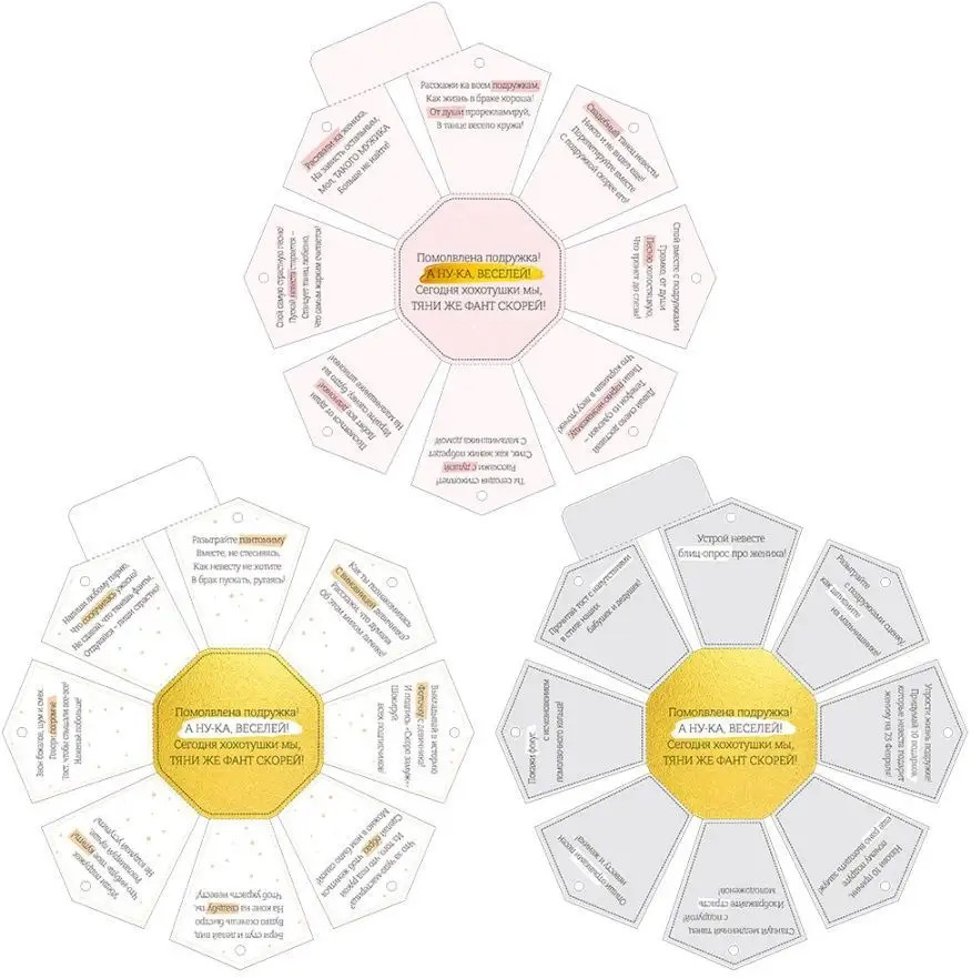 💳 Оплатить за товар можно при получении 🇰🇿 Есть бесплатная доставка по Казахстану 🎁 Копите бонусы с каждой покупки Набор фантов для проведения свадебного торжества. Три картонные «ромашки» с 8 заданиями-лепестками — это целых 24 весёлых задания для молодожёнов и гостей! Размер одной «ромашки» — 25×25см. Лепестки легко отрываются! Проводите праздник весело и без реквизита! |
