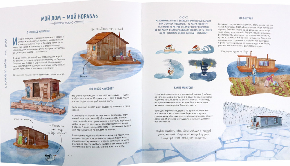Серия: Архи-хи-тектура Как вы думаете, кому и зачем пришло в голову жить на воде? Из чего можно построить плавучий дом? Какие правила есть у водной жизни? Давайте проплывём по улицам водных деревень, заглянем на плавучую ферму, перекусим пиццей на дне океана и найдём ответы на эти вопросы. Заодно отдохнём в подводном отеле, покатаемся в автобусе-амфибии, узнаем, как устроена плавучая электростанция, познакомимся со знаменитыми путешественниками, которые в одиночку переплыли океан. А ещё наденем акваланг и посетим подводный музей. Готовы? Тогда открывайте книгу и плывите за нами! |