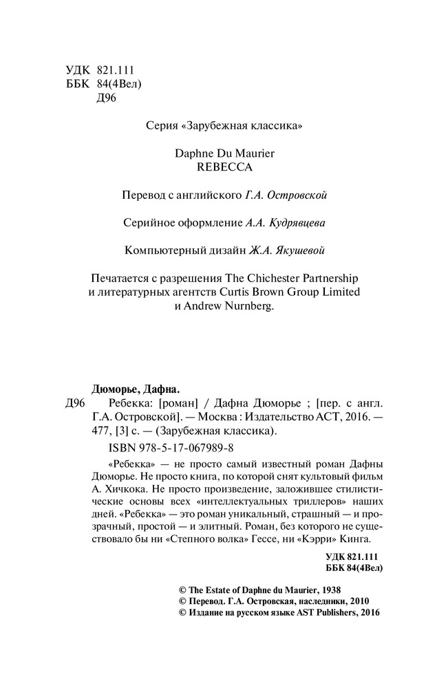 "Ребекка" - одна из моих любимых книг. Прочитала ее впервые еще в юности, и с тех пор она прочно заняла свое место в моей читательской душе. Книга отличного качества. Спасибо.