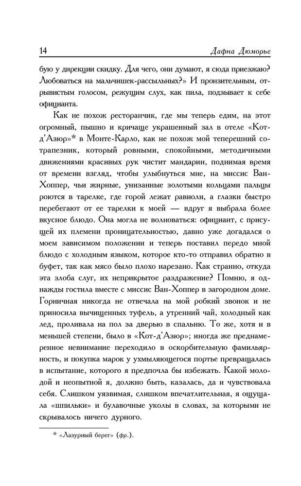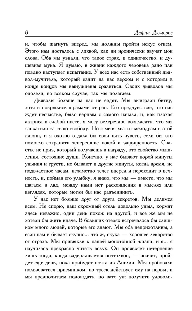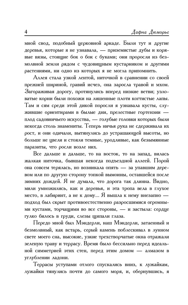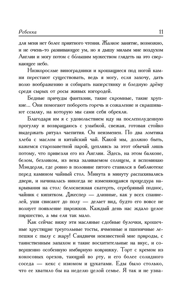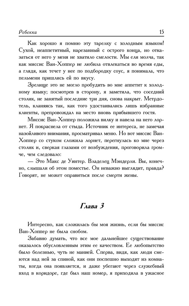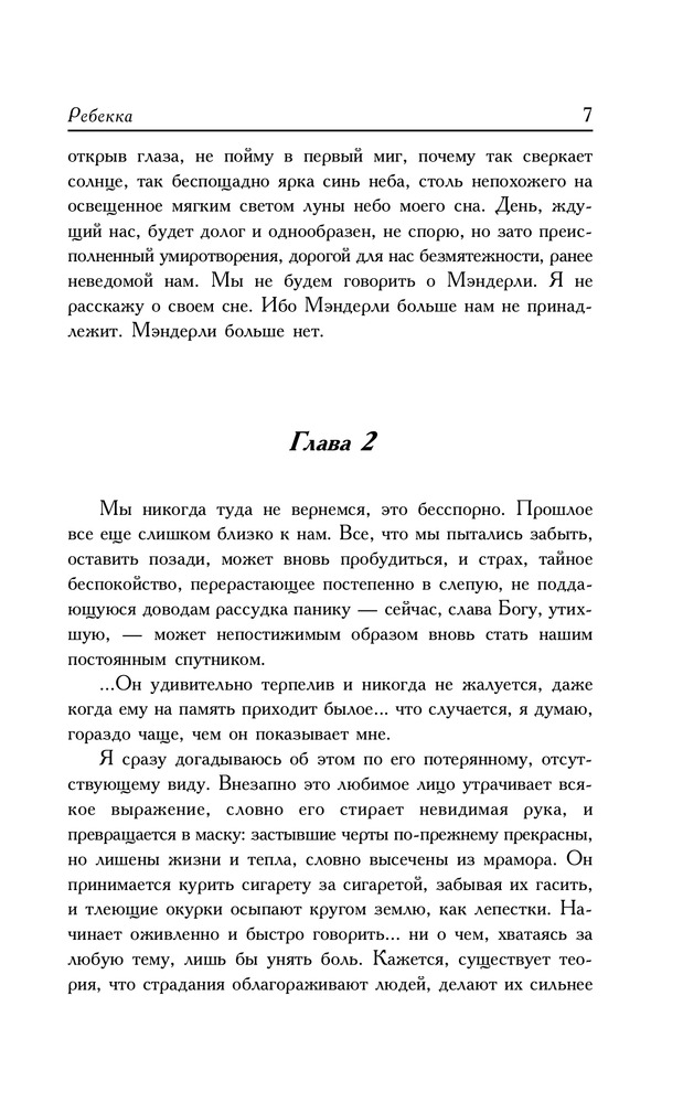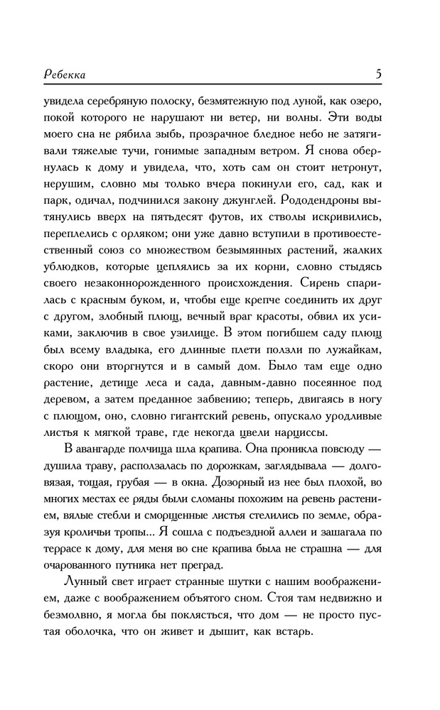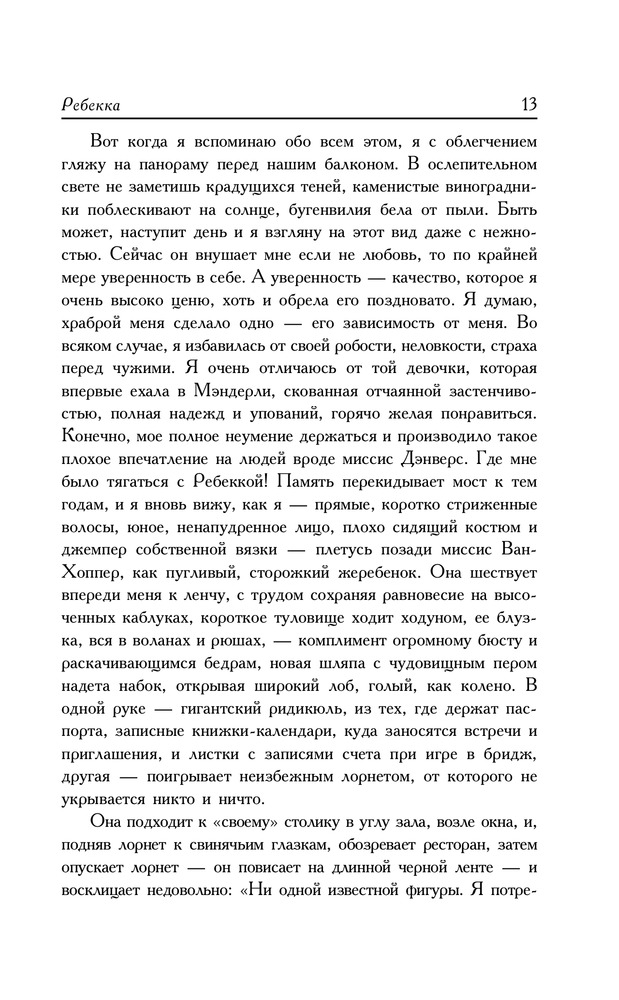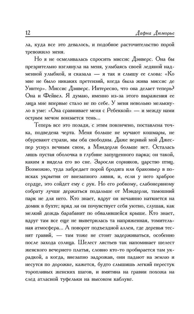 «Ребекка» — это роман уникальный, страшный — и прозрачный, простой — и элитный. Роман, без которого не существовало бы ни «Степного волка» Гессе, ни «Кэрри» Кинга. |