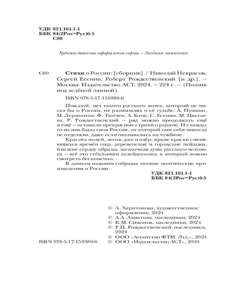 Серия: Поэзия под зелёной лампой Пожалуй, нет такого русского поэта, который не писал бы о России, не размышлял о её судьбе. А. Пушкин, М. Лермонтов, Ф. Тютчев, А. Блок, С. Есенин, М. Цветаева, Р. Рождественский — ряд можно продолжать ещё и ещё — оставили прекрасные строки о родине. И у каждого из них была своя Россия, от которой они себя никогда не отделяли, даже если оказывались на чужбине. Красота полей, лесов, рек и озёр, яркие краски сменяющихся времён года, деревенские и городские пейзажи, близкие сердцу образы, загадочная душа русского человека — всё это стёклышки калейдоскопа, в который можно смотреть бесконечно. В данном издании собраны лучшие поэтические произведения о России. |