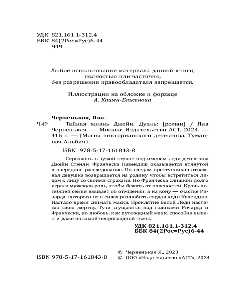 Серия: Магия викторианского детектива. Туманная Альбия Скрываясь в чужой стране под именем леди-детектива Джейн Стэнли, Франческа Кавендиш оказывается втянутой в очередное расследование. По следам преступников отважная девушка возвращается на родину, чтобы встретиться лицом к лицу со своими страхами. Но Франческа слишком долго играла мужскую роль, чтобы бежать от опасностей. Кровь погибшей семьи взывает об отмщении, а на кону — счастье Ричарда, которого не в силах разлюбить гордая леди Кавендиш. Настало время снимать маски. Проклятие Белой Леди настигло свою жертву. Тучи сгущаются над головами Ричарда и Франчески, но любовь, как путеводный маяк, способна вывести даже из самой непроглядной тьмы. |