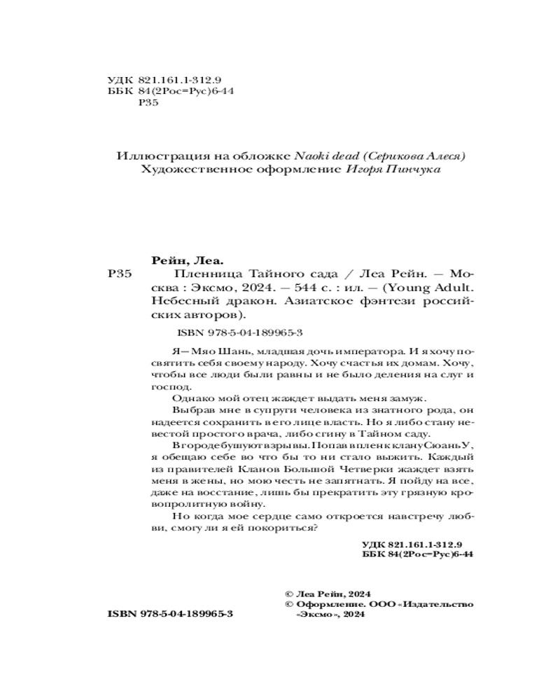 Серия: Young Adult. Небесный дракон. Азиатское фэнтези российских авторов «Пленница Тайного сада» — руновелла, созданная по мотивам мифа о китайской богине милосердия Гуаньинь. По легенде жестокий король хотел выдать свою дочь Мяо Шань (земное воплощение богини) за богатого, но не любящего ее господина. Девушка согласилась подчиниться, только если брак облегчит три несчастья народа: старение, болезни и смерть. В наказание отец принудил Мяо Шань к тяжкому труду, а затем и вовсе казнил дочь. В адском царстве демоны не тронули ее, а в аду расцвели цветы. В нашей истории Мяо Шань в XX веке бросает вызов традициям, плетет интриги ради цели и возглавляет восстание! |