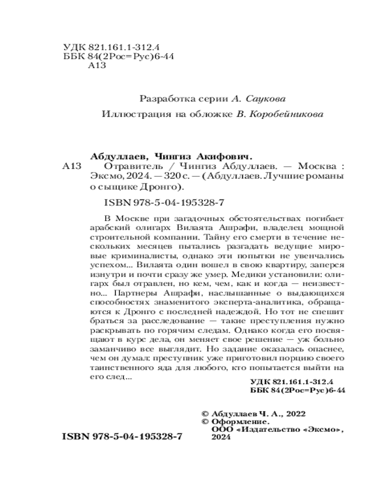 Серия: Абдуллаев. Лучшие романы о сыщике Дронго. Эконом (обложка) В Москве при загадочных обстоятельствах погибает арабский олигарх Вилаята Ашрафи, владелец мощной строительной компании. Тайну его смерти в течение нескольких месяцев пытались разгадать ведущие мировые криминалисты, однако эти попытки не увенчались успехом... Вилаята один вошел в свою квартиру, заперся изнутри и почти сразу же умер. Медики установили: олигарх был отравлен, но кем, чем, как и когда — неизвестно... Партнеры Ашрафи, наслышанные о выдающихся способностях знаменитого эксперта-аналитика, обращаются к Дронго с последней надеждой. Но тот не спешит браться за расследование — такие преступления нужно раскрывать по горячим следам. Однако когда его посвящают в курс дела, он меняет свое решение — уж больно заманчиво все выглядит. Но задание оказалась опаснее, чем он думал: преступник уже приготовил порцию своего таинственного яда для любого, кто попытается выйти на его след... |