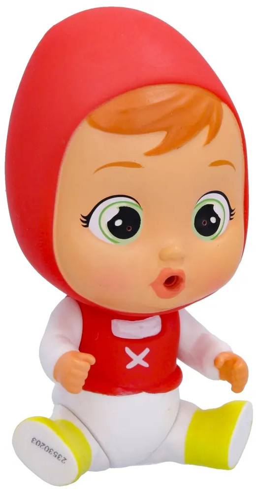 Кукла высотой 12 см, с подвижными ручками и ножками. Для того чтобы слезы вытекали из глаз при нажатии на животик, необходимо залить воду в специальный отсек на голове куклы и вынуть пустышку.